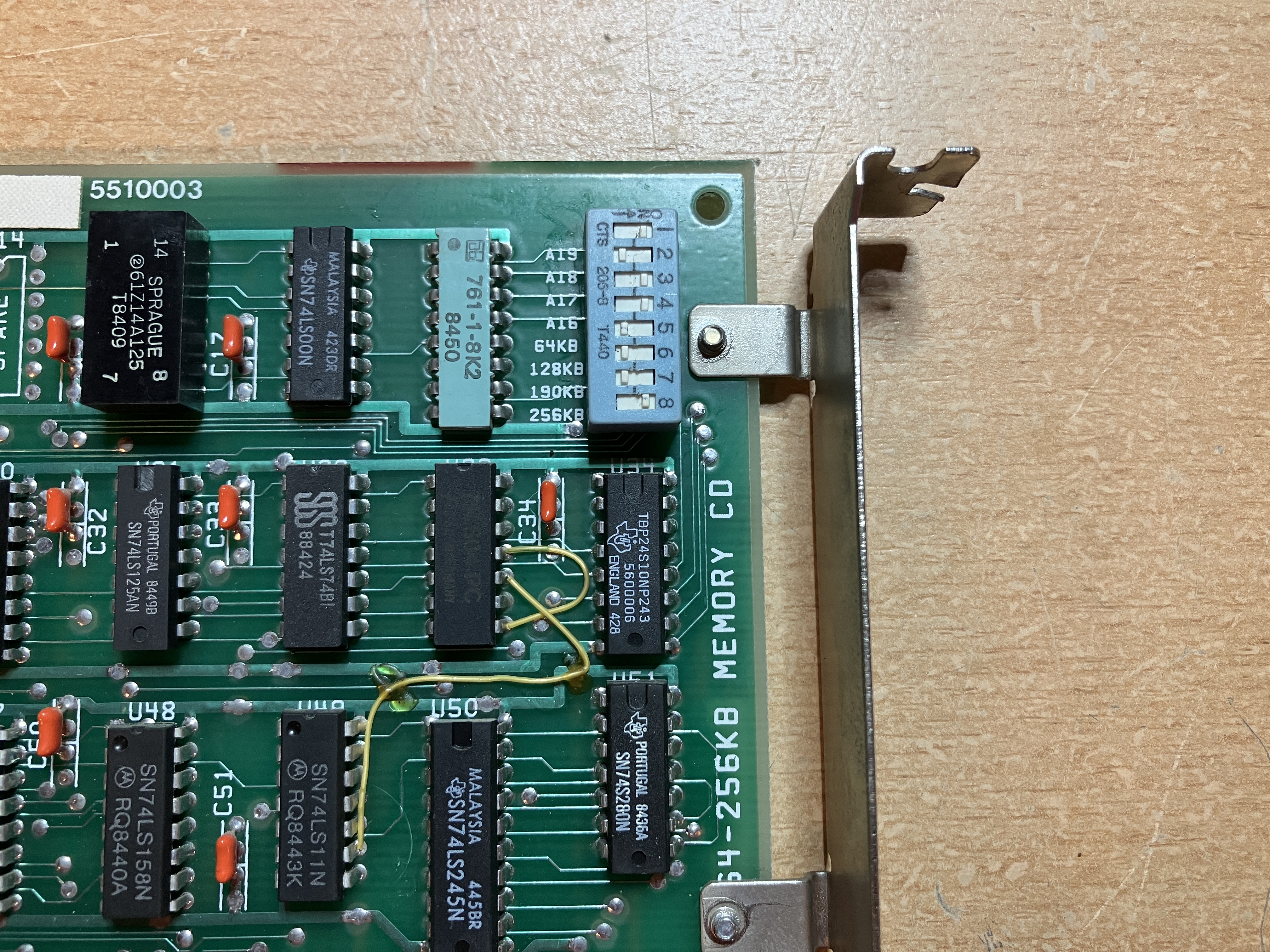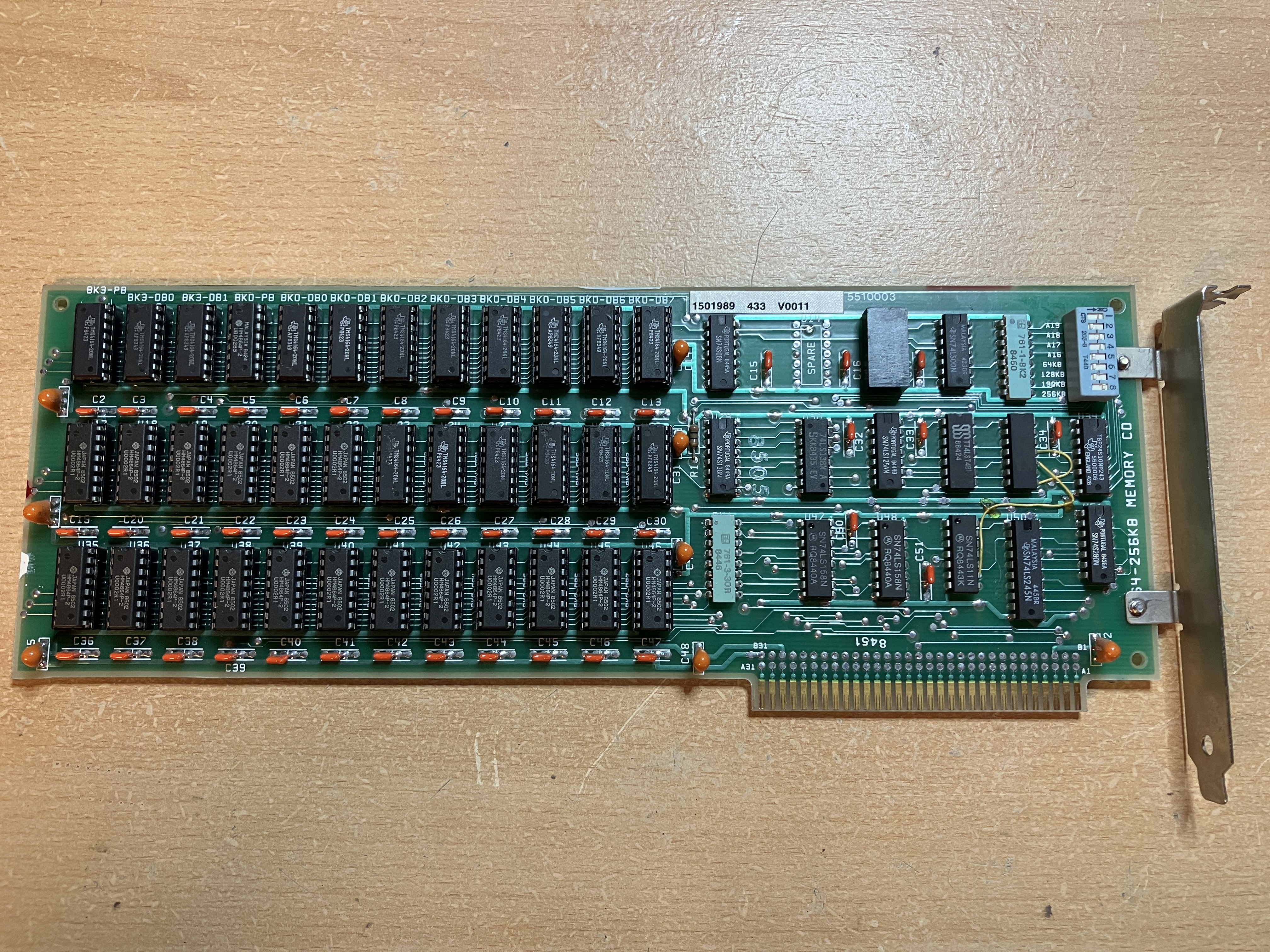sehr schnell an Größe gewannen, wurden gerne Speichererweiterungen auf Steckkarten genutzt, um den Hauptspeicher zu vergrößern. In diesem PC steckt eine 256 KB