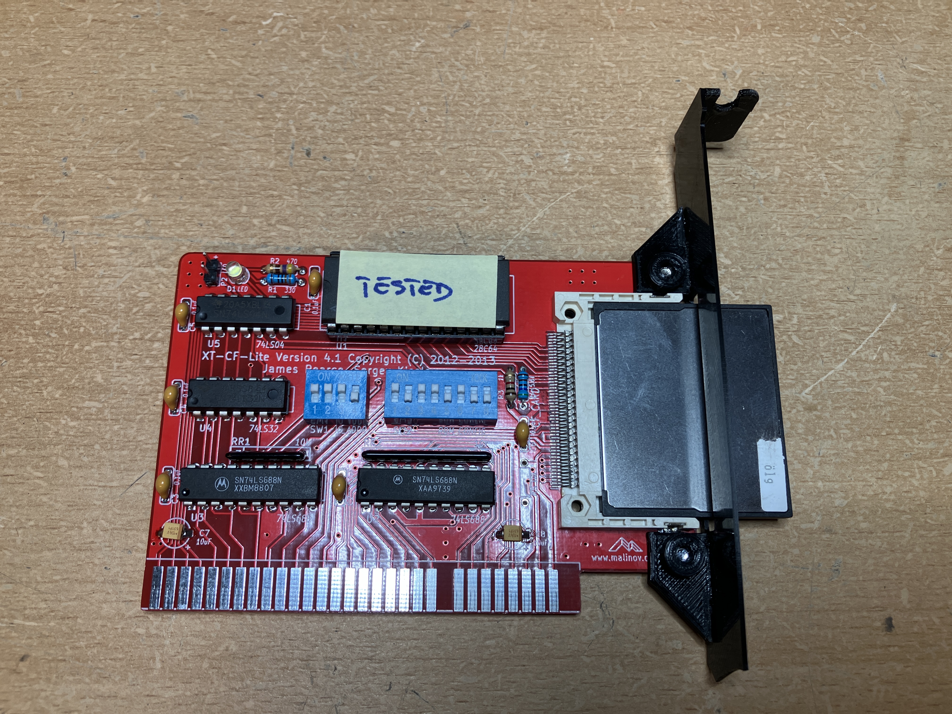 Da durch den Multi IO Controller ein Slot eingespart wurde, ist nun noch einer frei für eine Festplattenlösung. Eine XT-IDE CF Karte mit einer 32 MB CF Card bringt