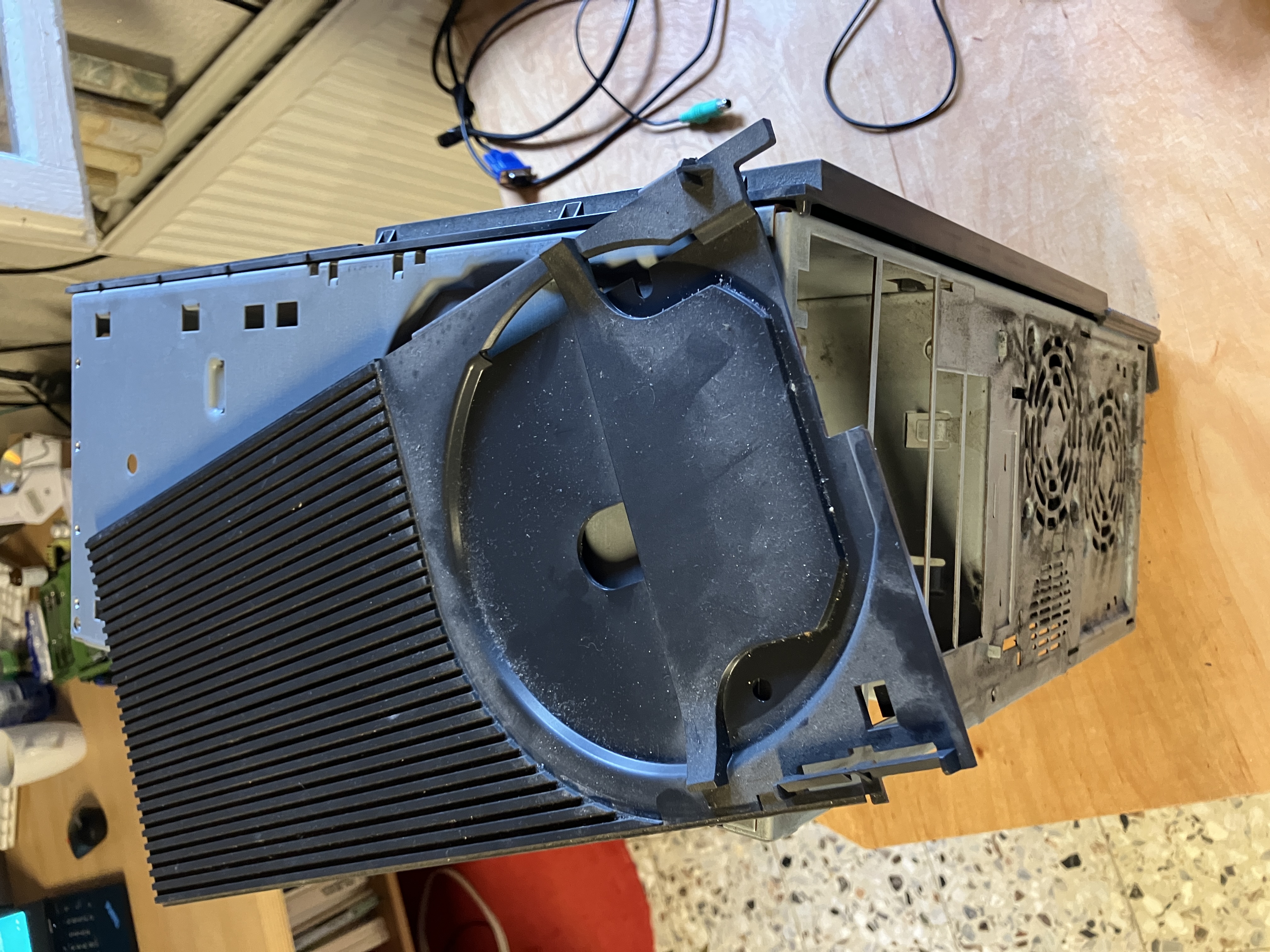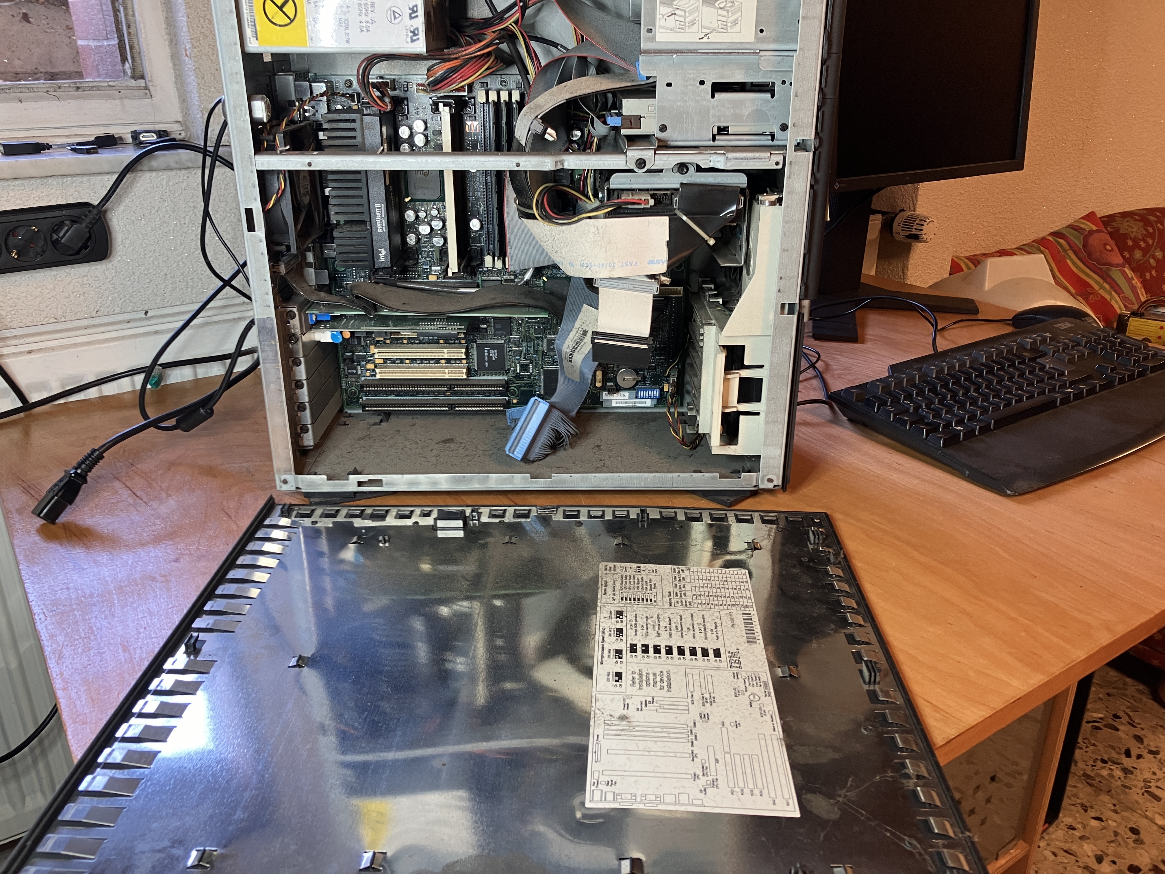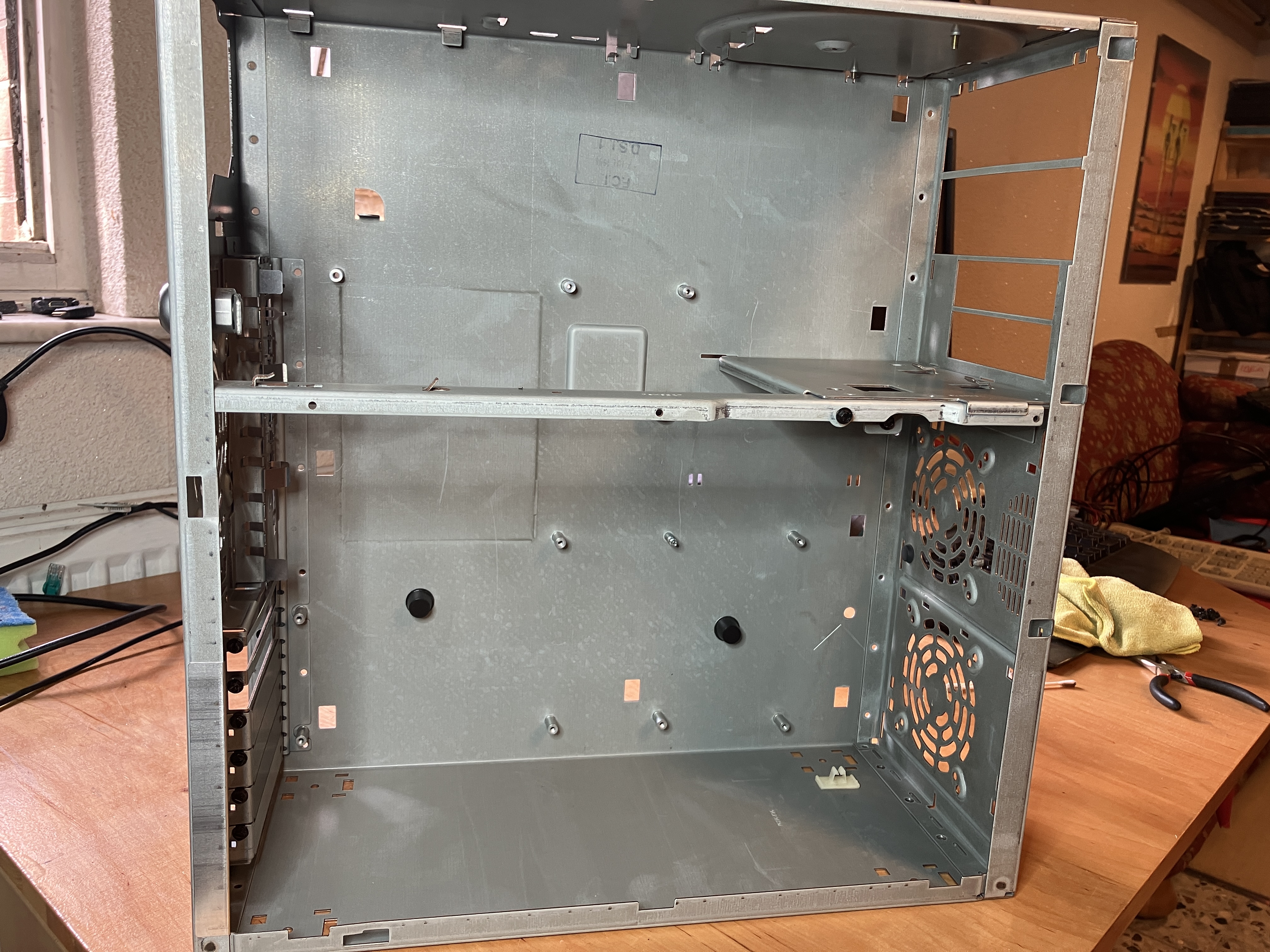 Hier 3 Aufnahmen im "Öffnungszustand" direkt nach dem Abholen. Etwas Staub hat sich schon angesammelt. Auf Folgebild 1 ist das Mainboard Layout gut zu sehen,