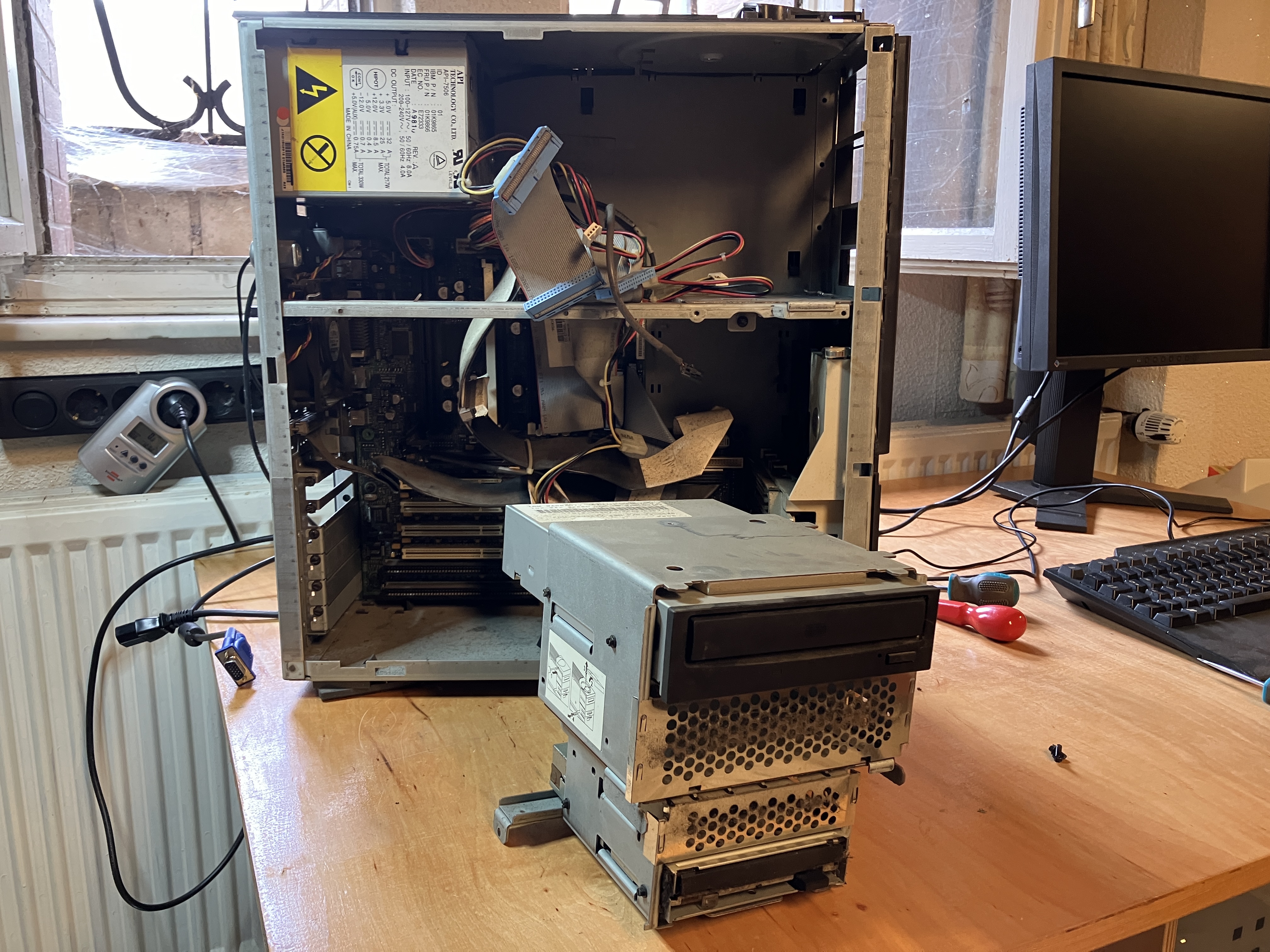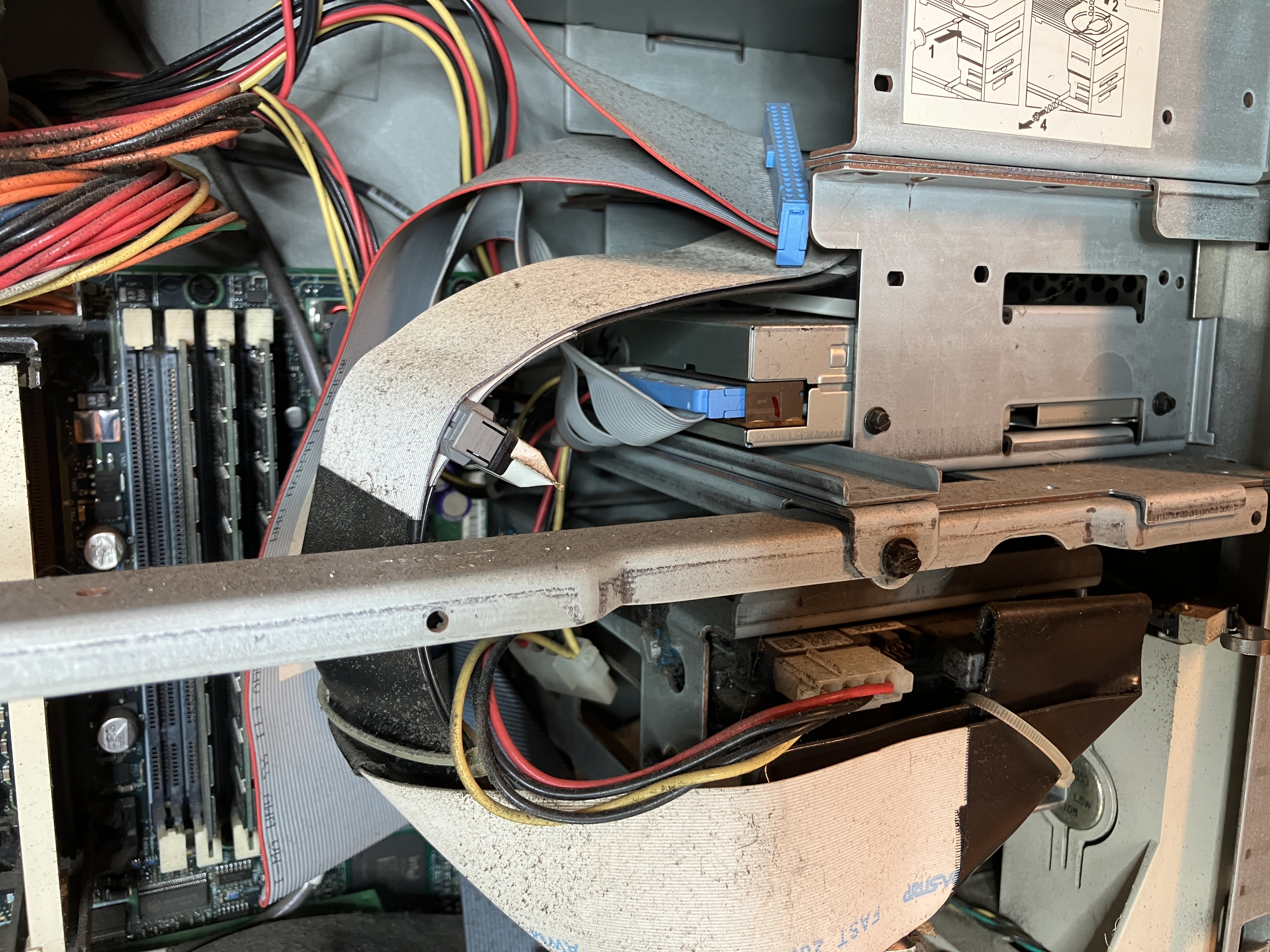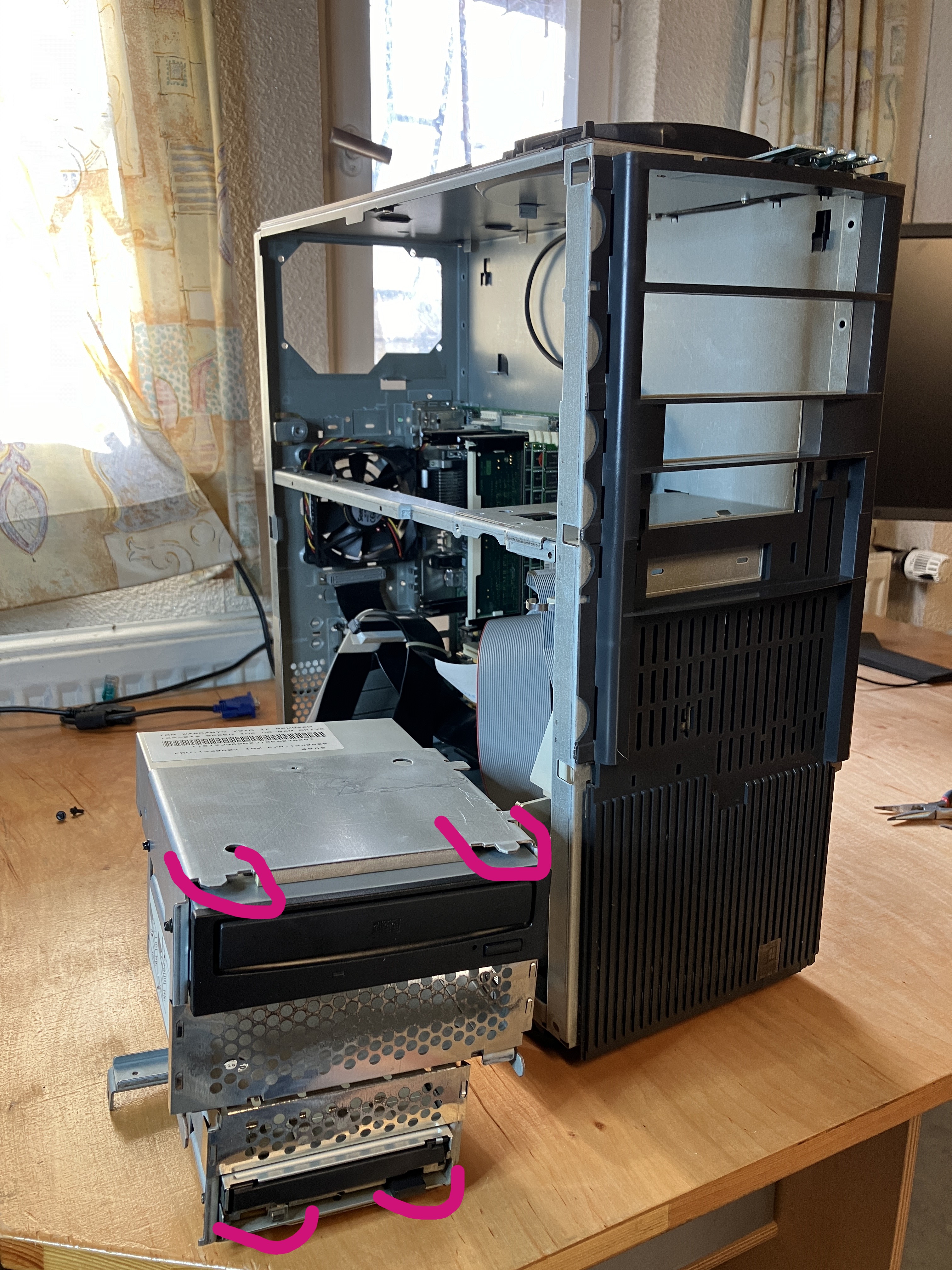 Nach dem Ausbau des oberen Käfigs (siehe Folgebild 1) kann man sehr gut die DatenKabel im inneren entfernen. IBM war hier immer vorbildlich und hat die Systeme