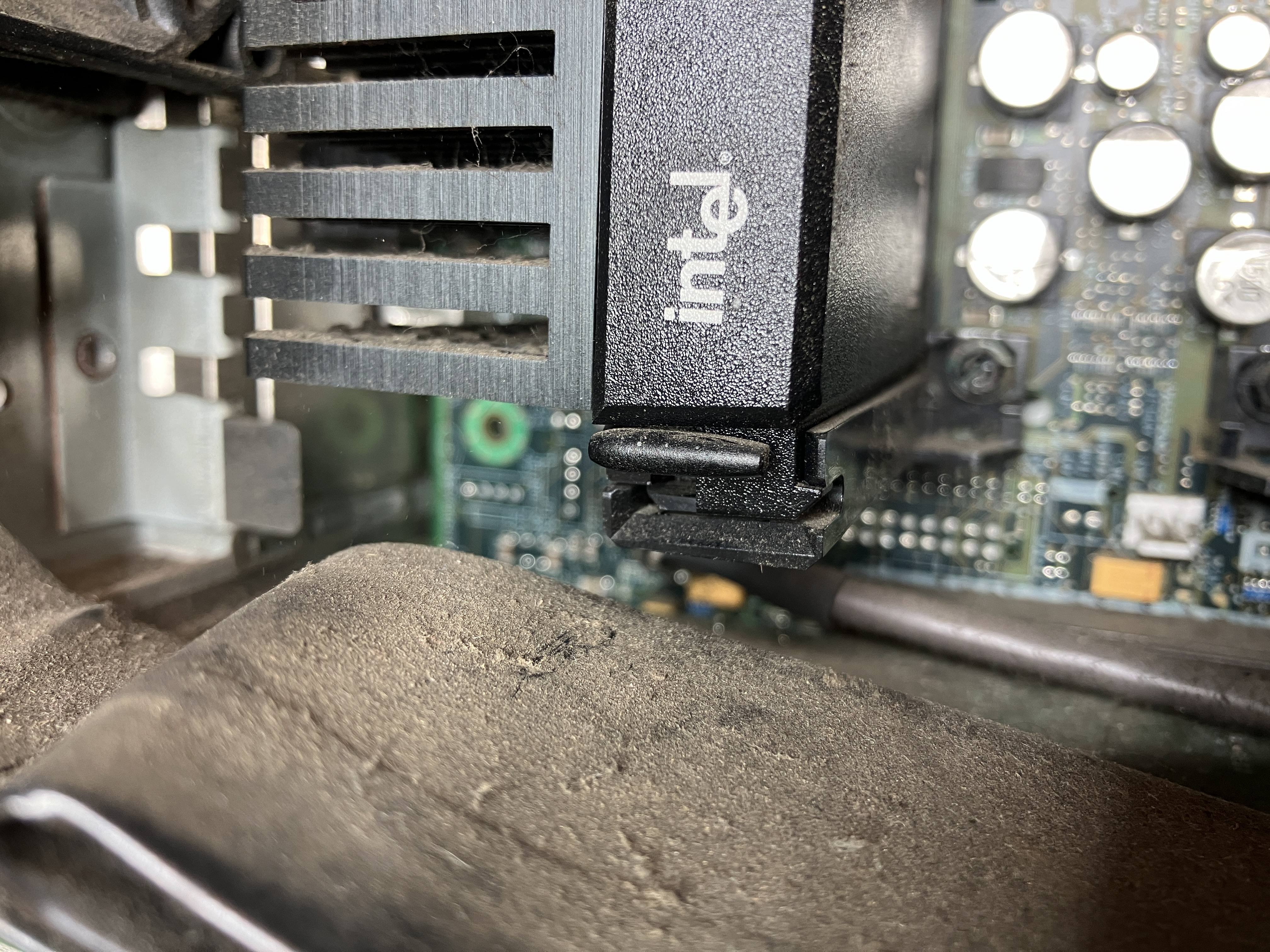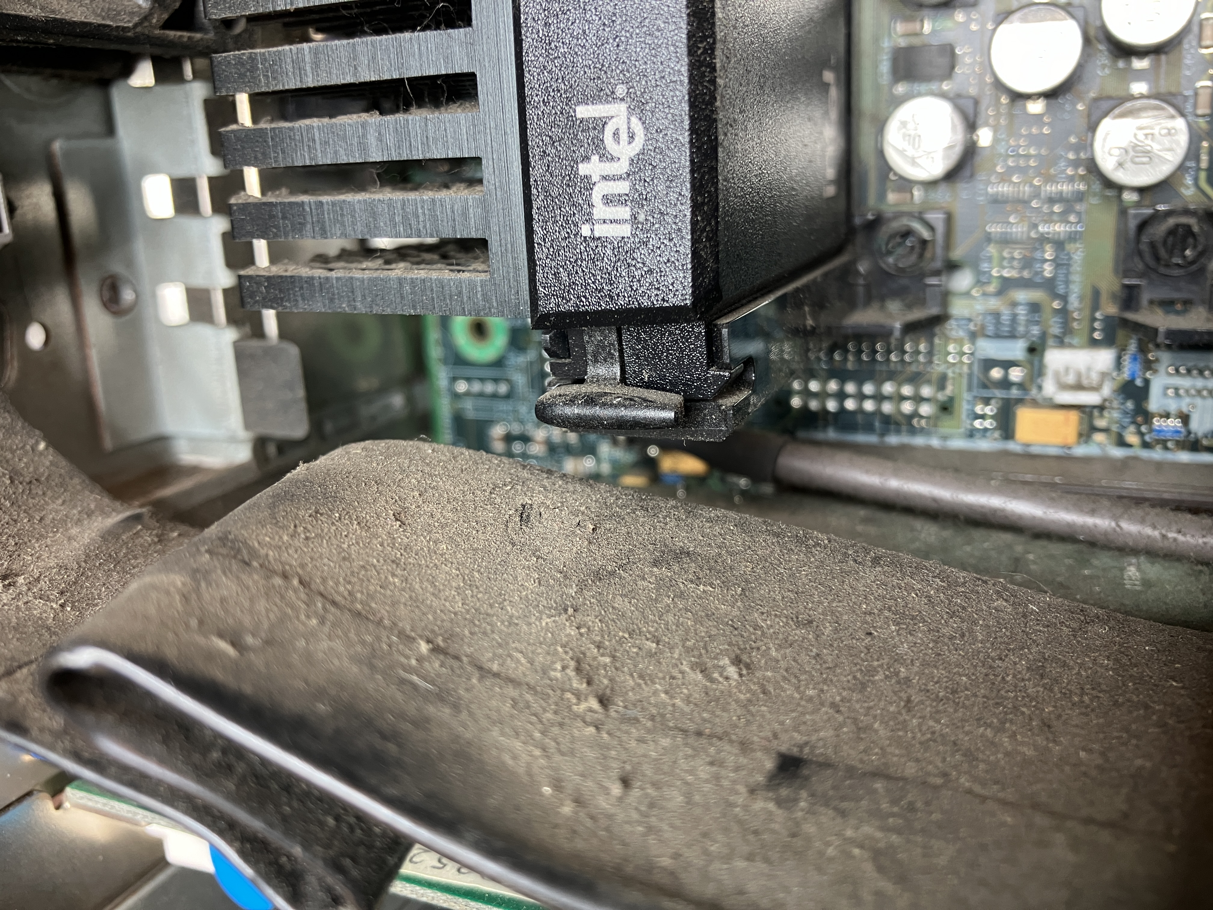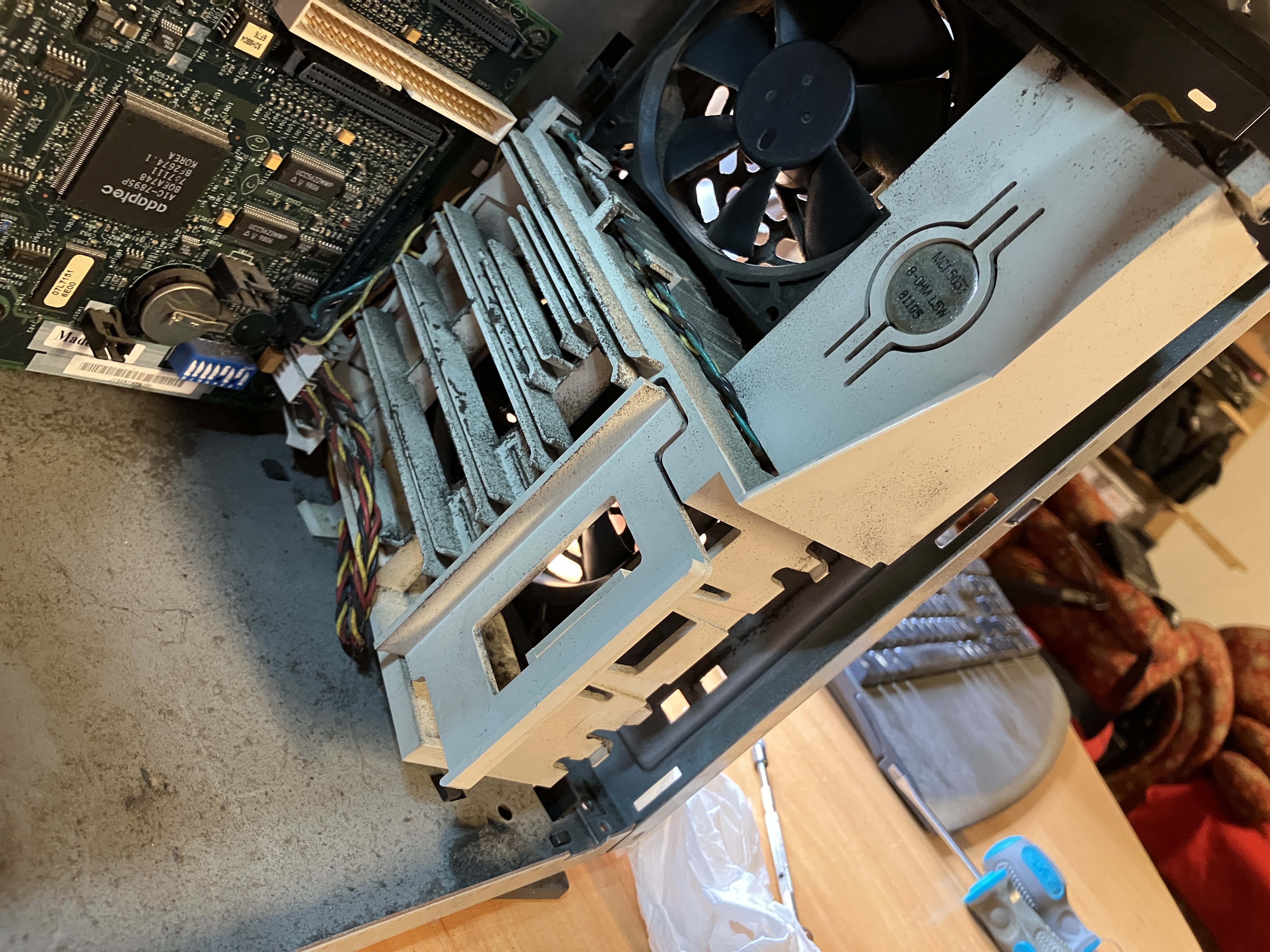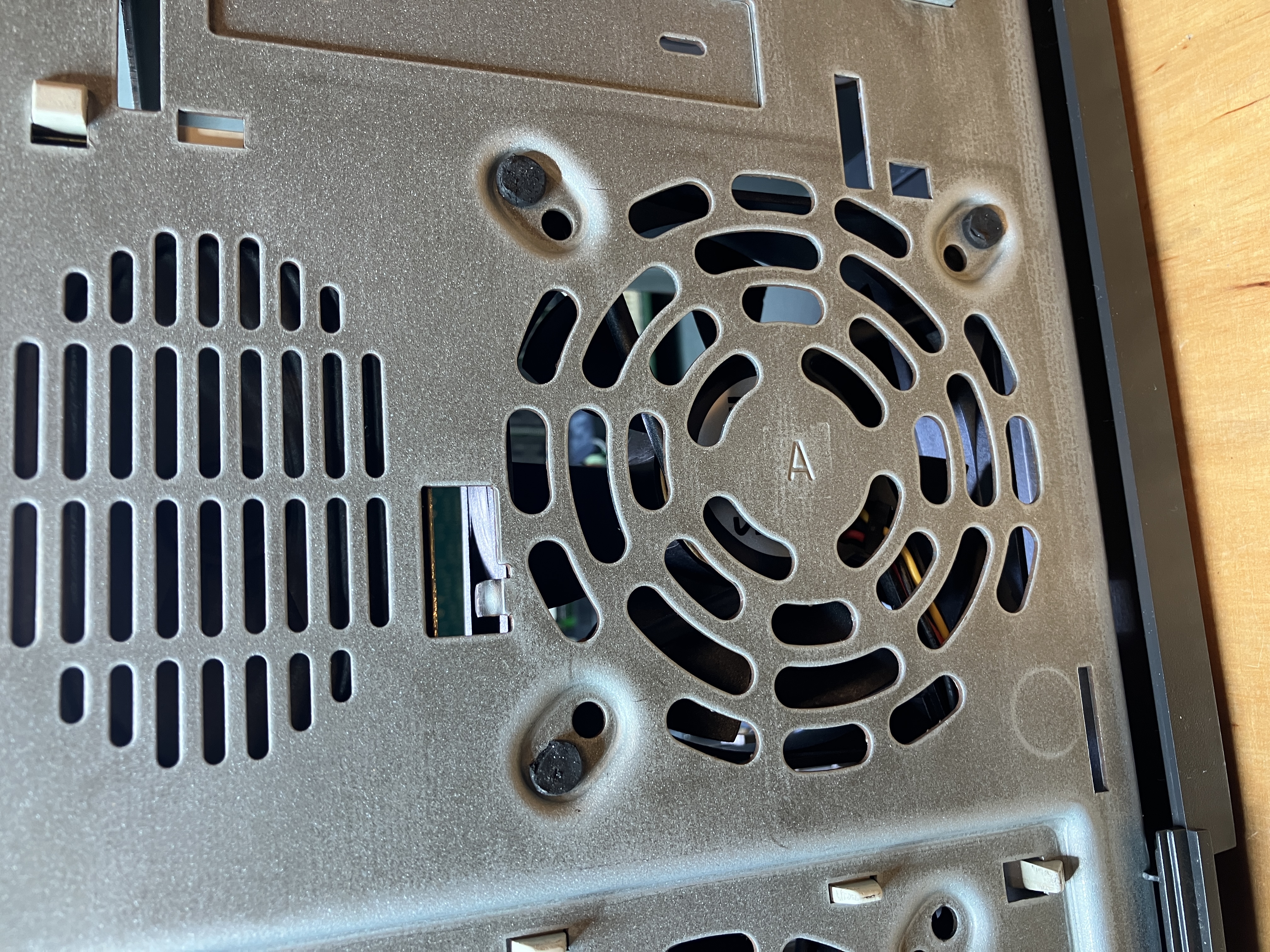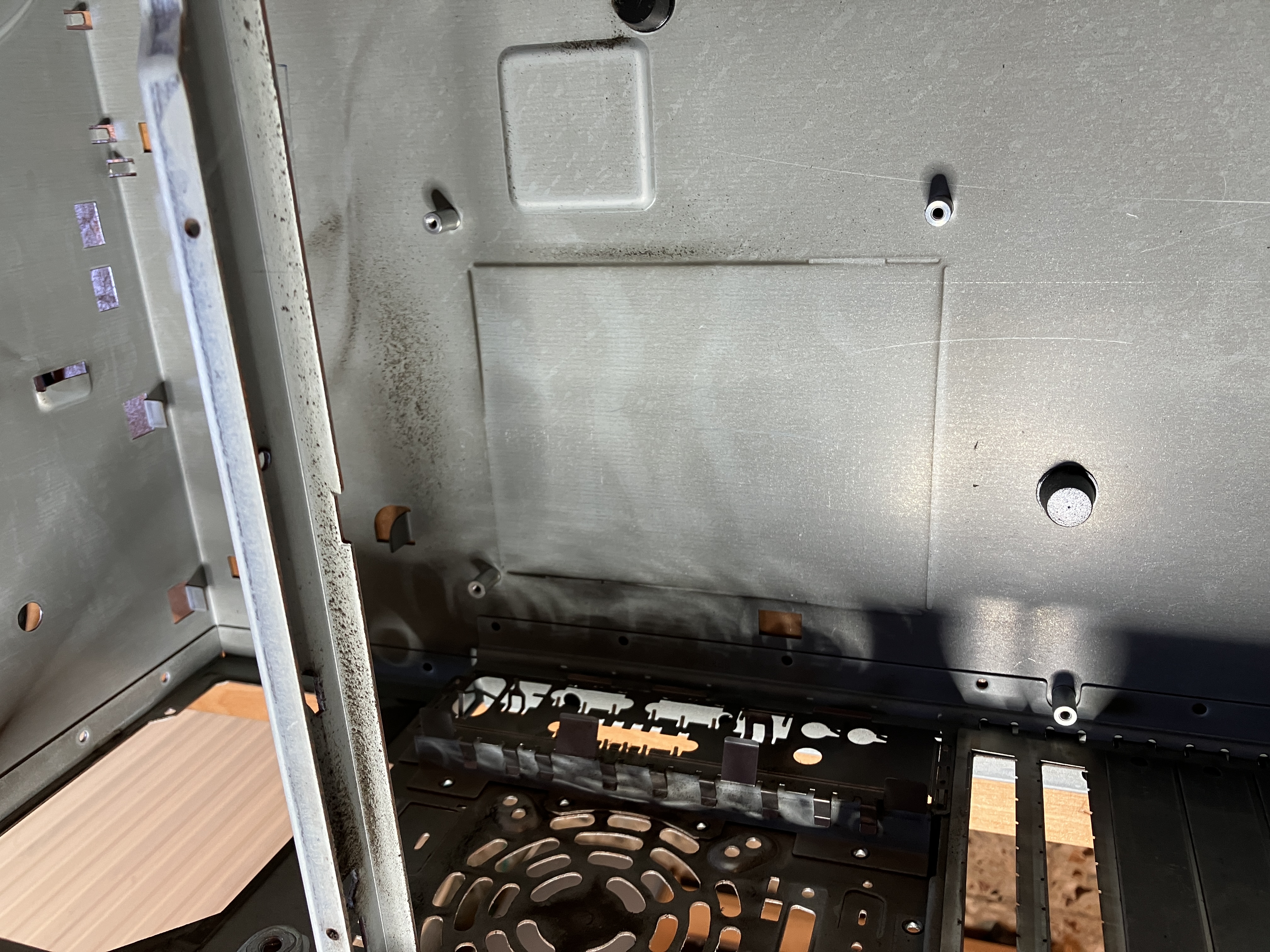 Der Staub auf dem Kartenhalter ist wirklich nicht zu übersehen. Mit verbaut sind dort noch ein Lüfter, der Intrusionschalter und der Lautsprecher.