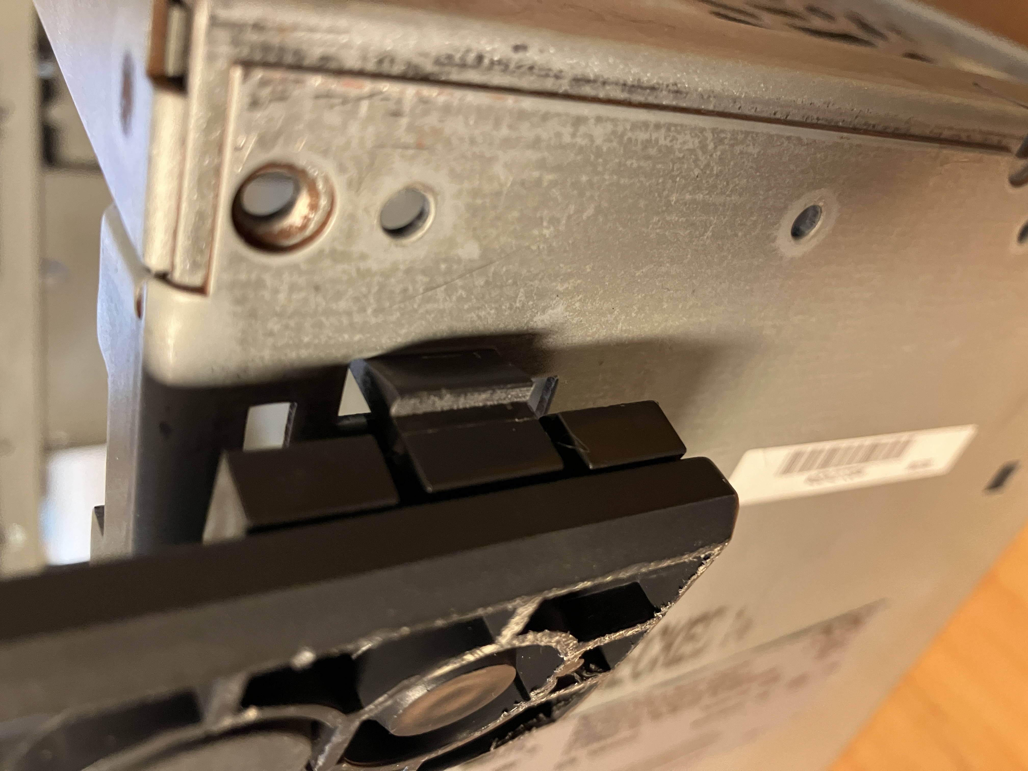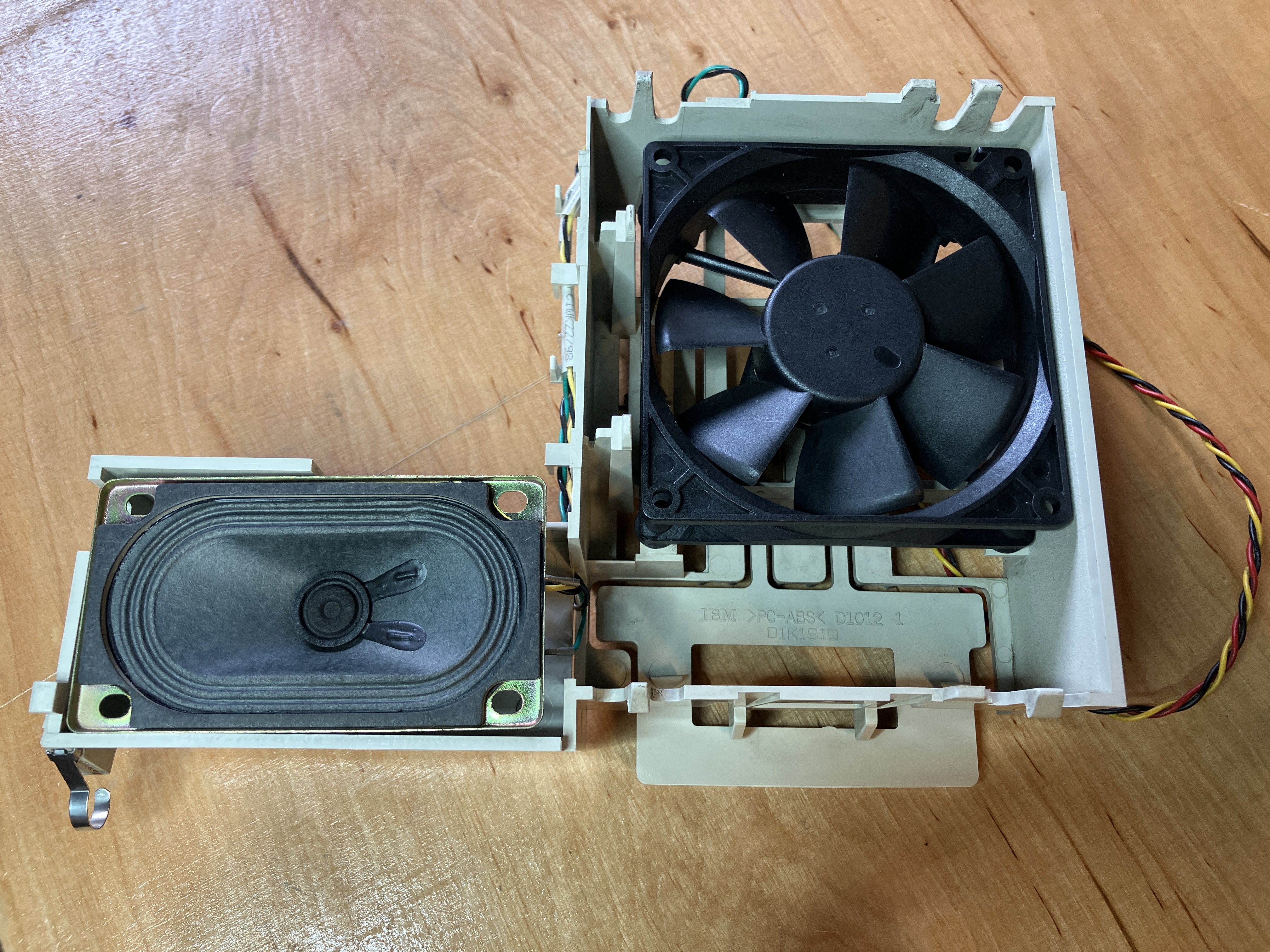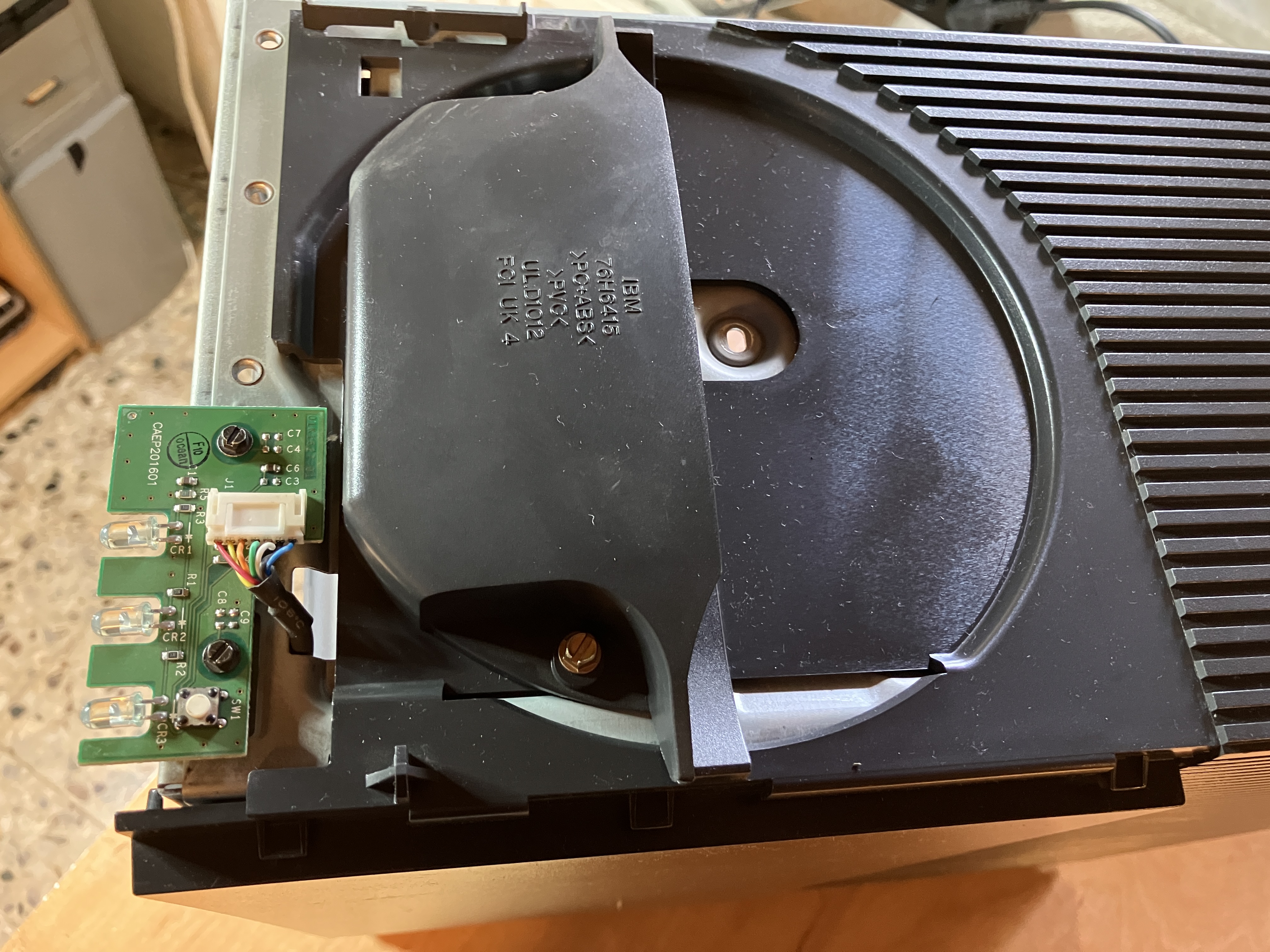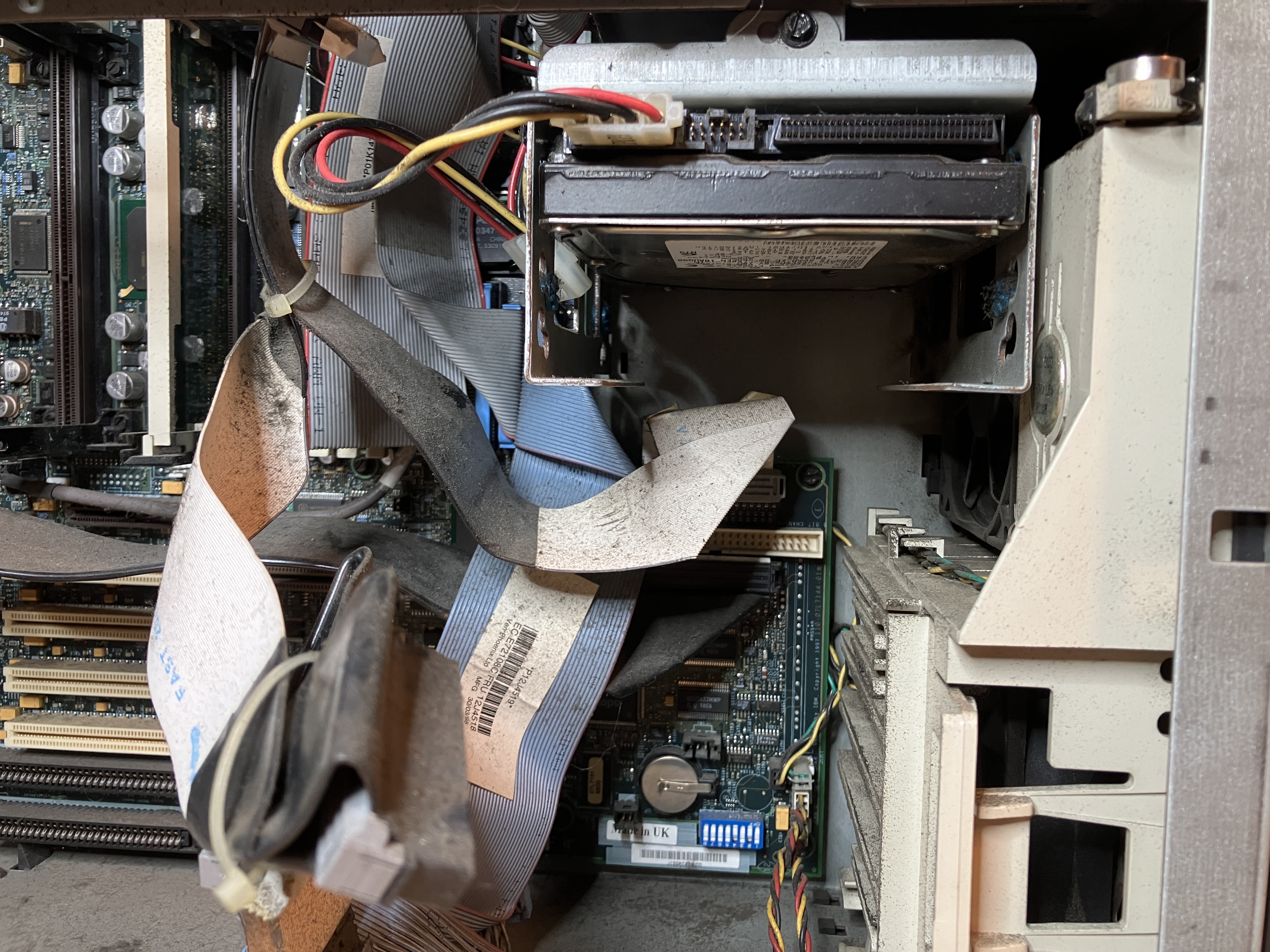 Der untere Käfig enthält die Festplatte. Nach näherer Untersuchung stellt sich heraus, das es sich um eine IBM Festplatte handelt. In diesen Jahren (bis 2002) hat IBM