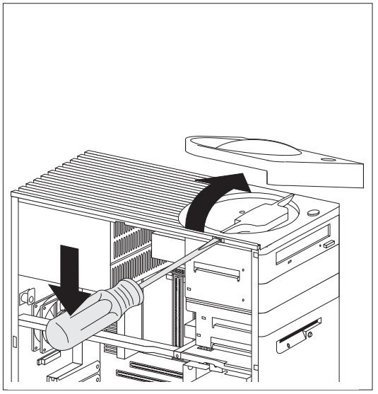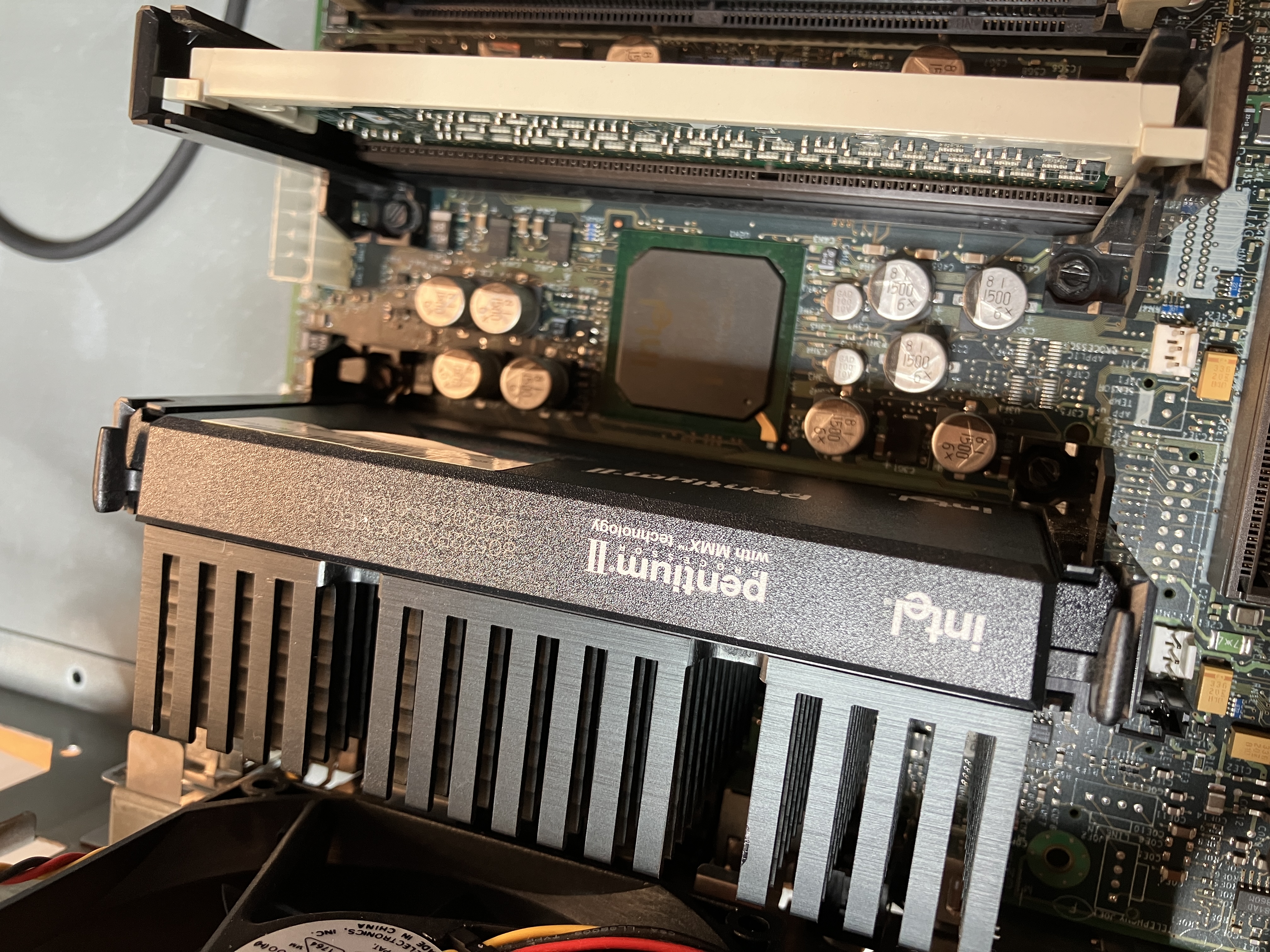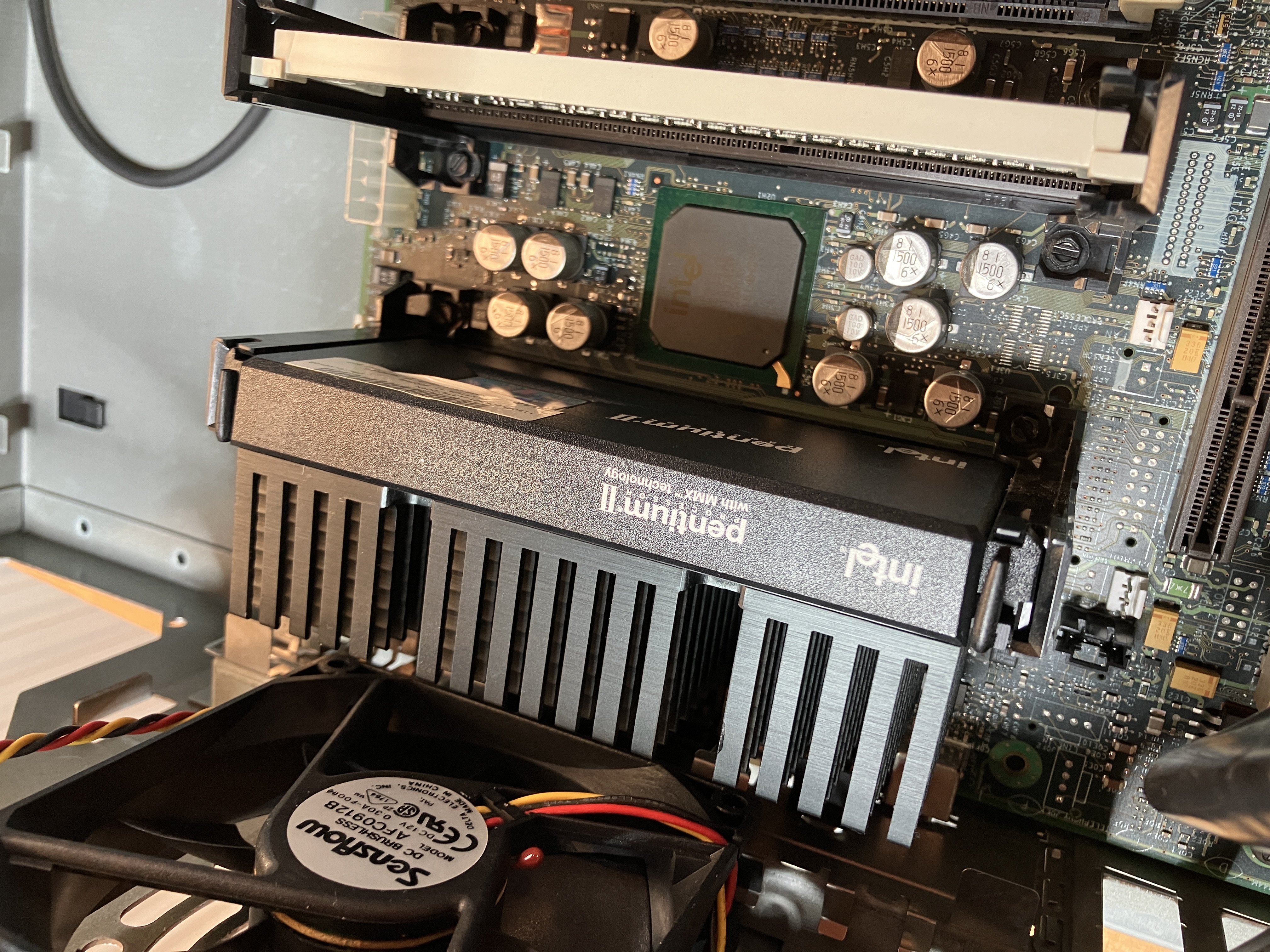 Die CPU in diesem Rechner besitzt nur einen Passivkühler. Die Slot 1 Befestigung sind 2 Haltenasen, die am oberen Rand der CPU in Richtung der CPU Mitte geschoben