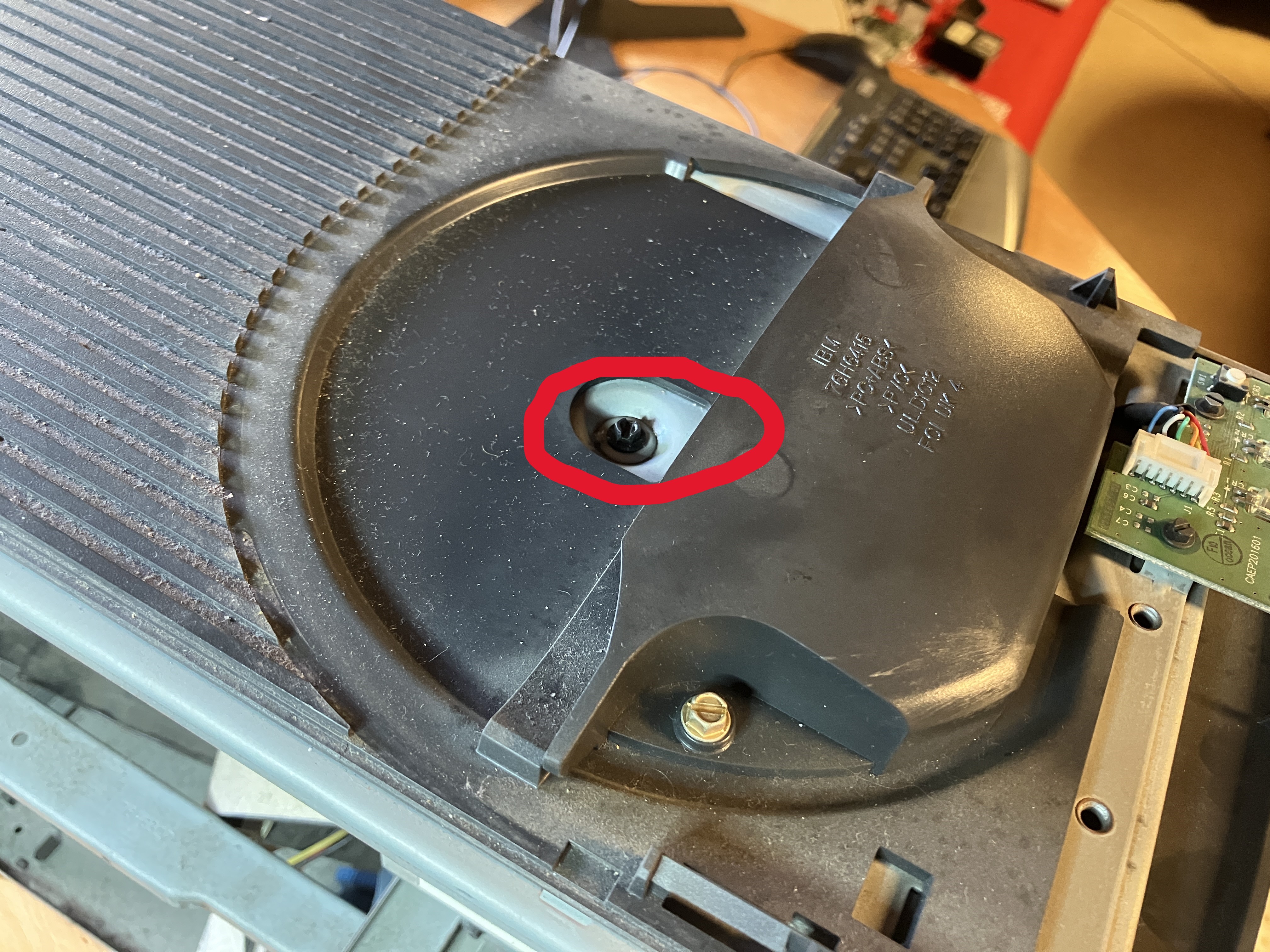 Direkt auf der Oberseite, unter der bereits entfernten, oberen Abdeckung, befindet sich eine Schraube für den oberen Käfig (sie Folgebild 1). Diese Schraube ist zu lösen