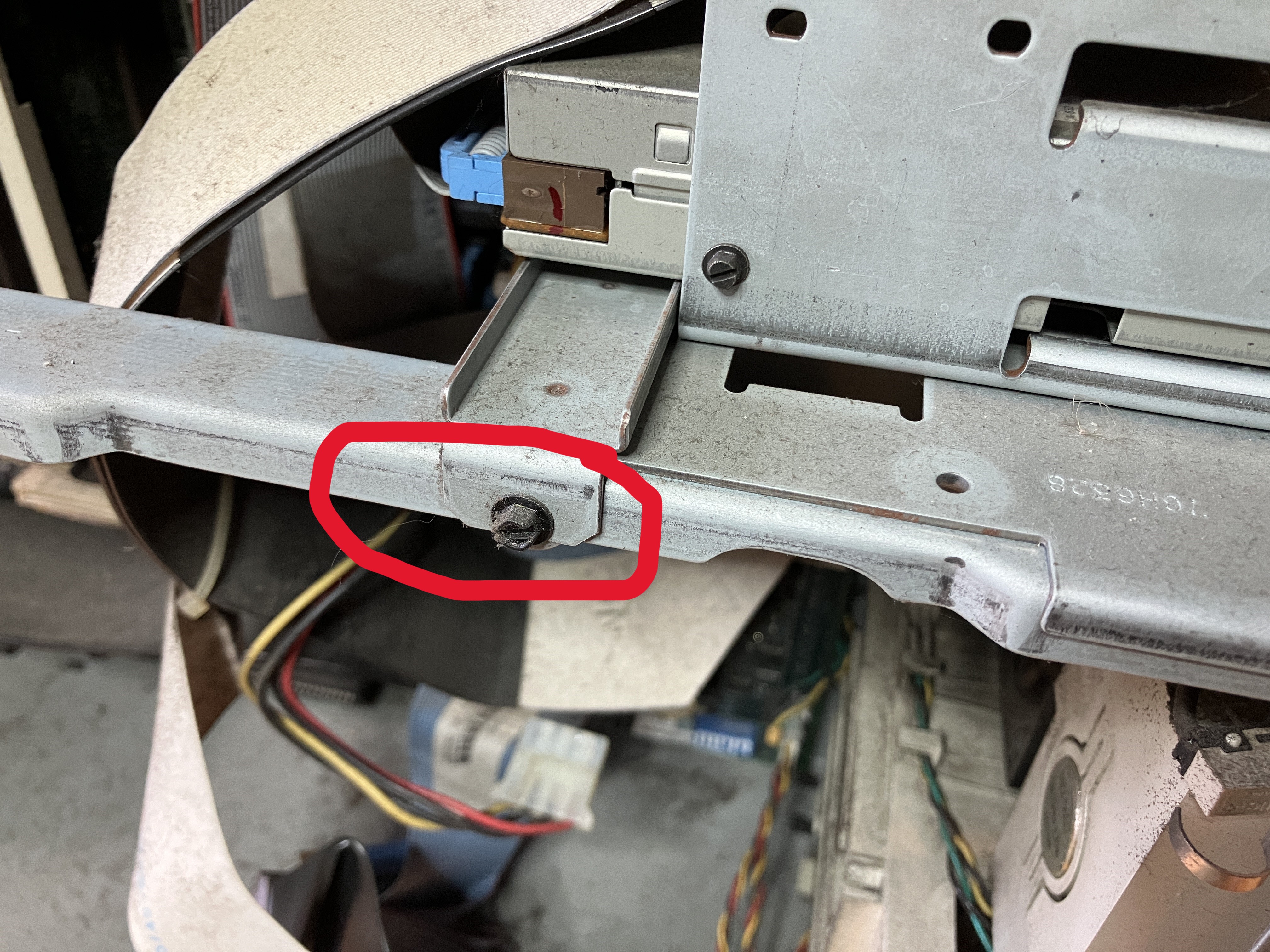 und eine weitere Schraube im inneren des PC (Siehe Folgebild 2). Danach (nach dem Lösen der Kabel) kann man den Käfig zur Seite herausziehen.