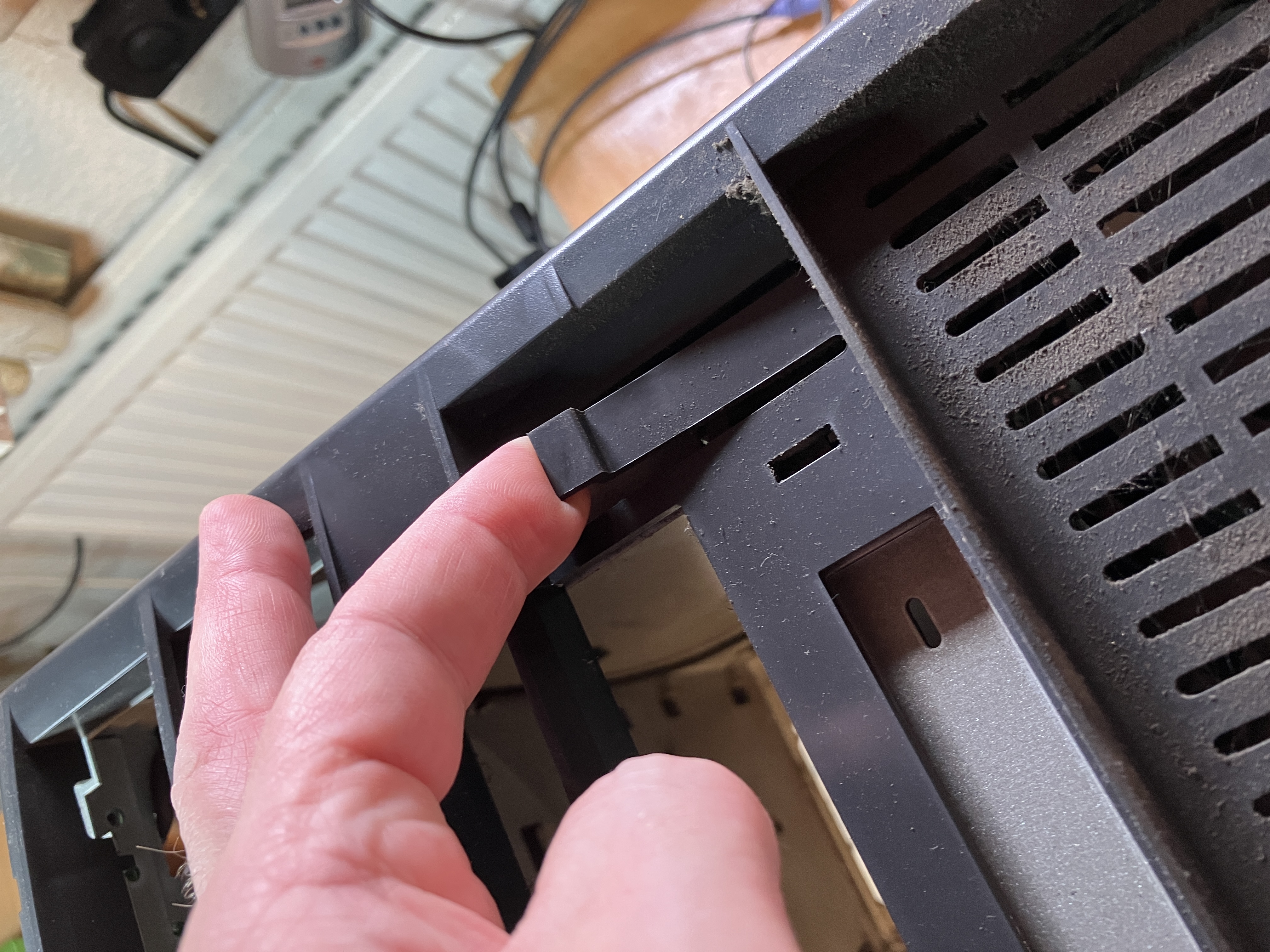 Danach kann man die Klammern, aussen am Gehäuse VORSICHTIG nach innen drücken, um den Kartenhalter zu lösen. Problem ist, dieser ist eingeklemmt zwischen dem Mainboard