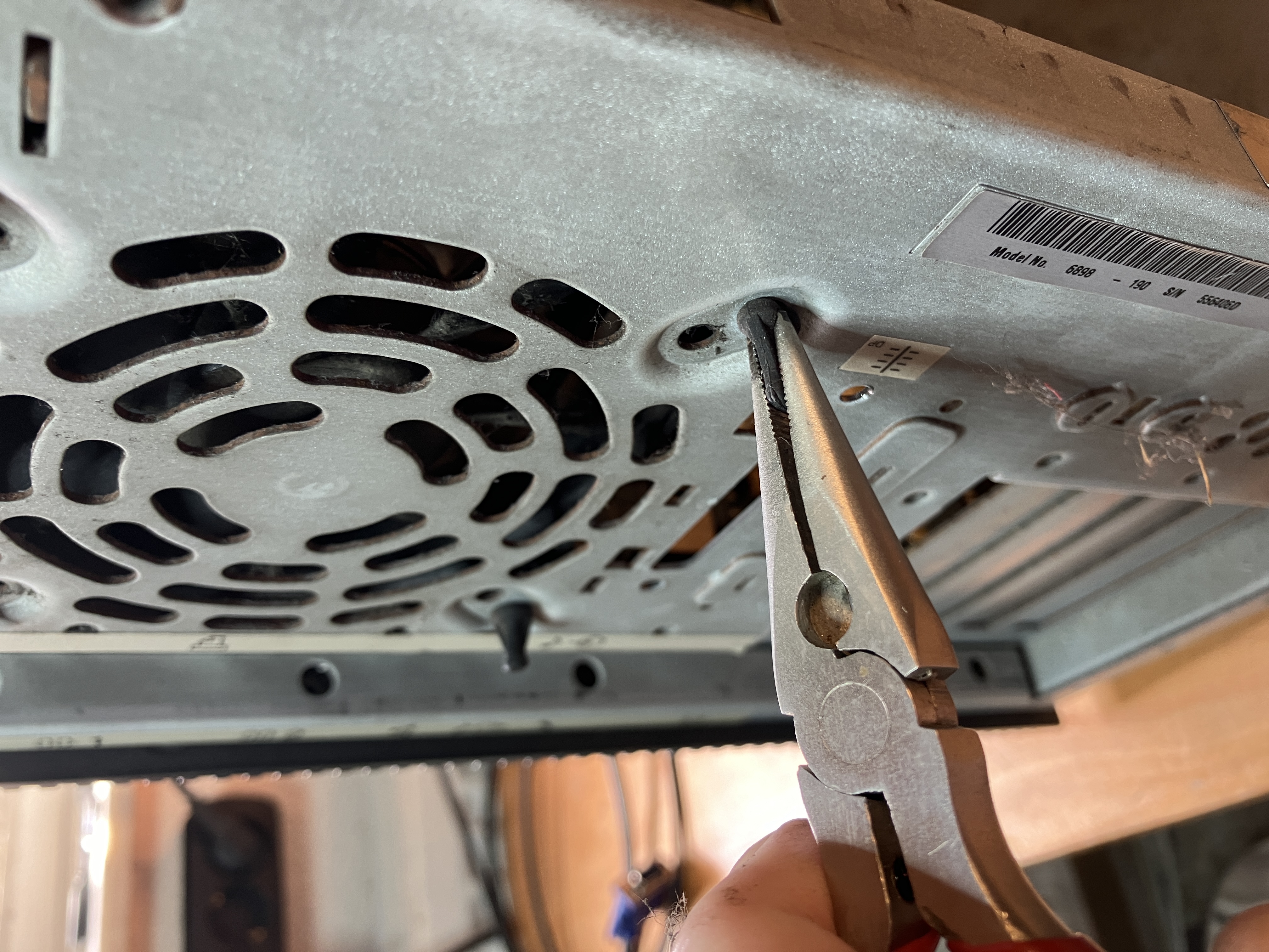 und dem unteren, vorderen Lüfter. Deshalb muß man diesen zuerst auch noch lösen. Hier wendet man am Besten die "Durchdrückmethode mit dem Schlitzschraubendreher an.