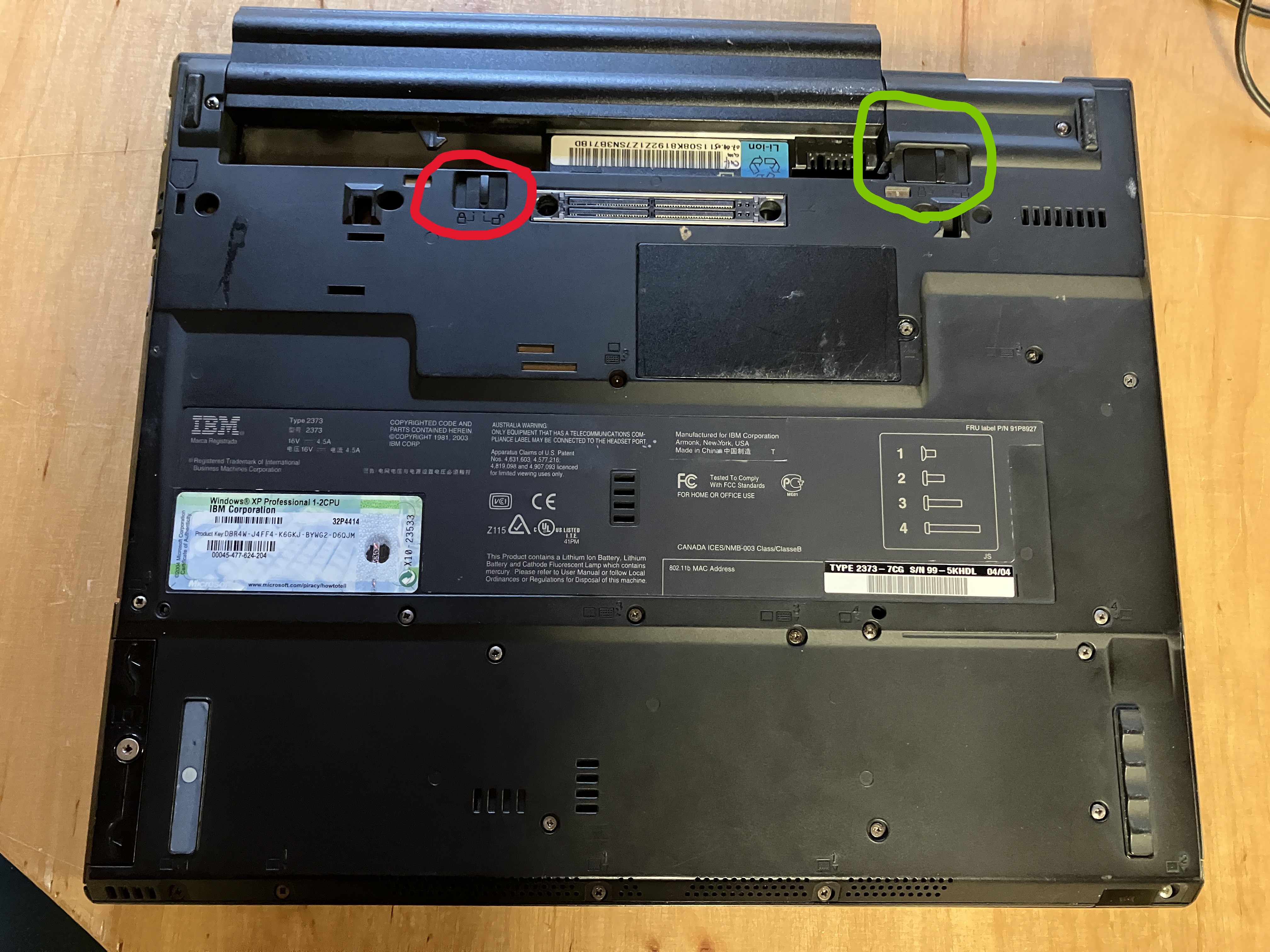 Als erstes muß der Akku raus. Der ist mit zwei Verriegelungen am Notebook befestigt. Die rechte Verriegelung (grün)