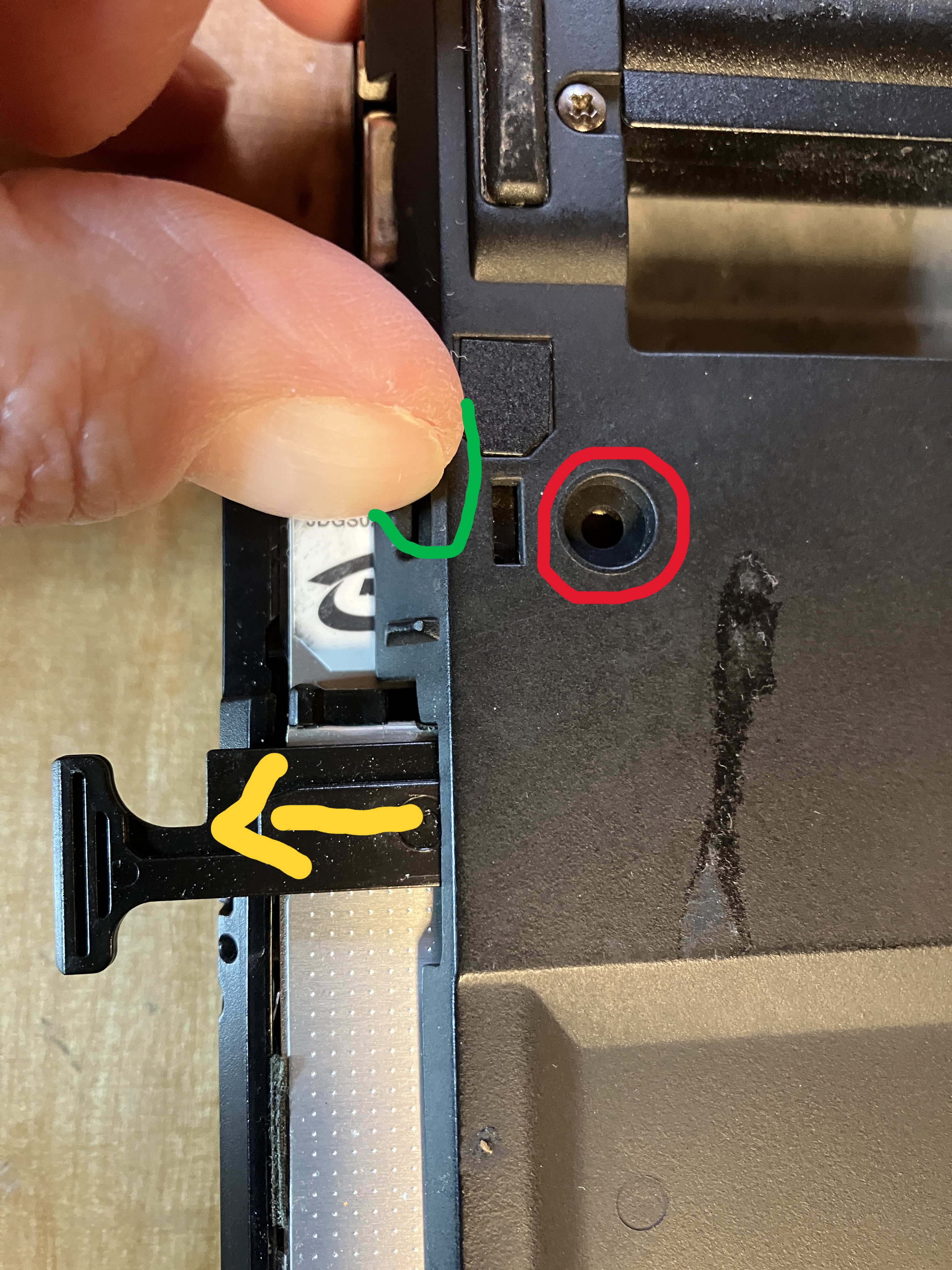 Bei der Festplatte muß erst die Arretierungsschraube (roter Kreis) gelöst und dann, ganz wichtig, das Notebook ein wenig aufgeklappt werden (gelber Pfeil).