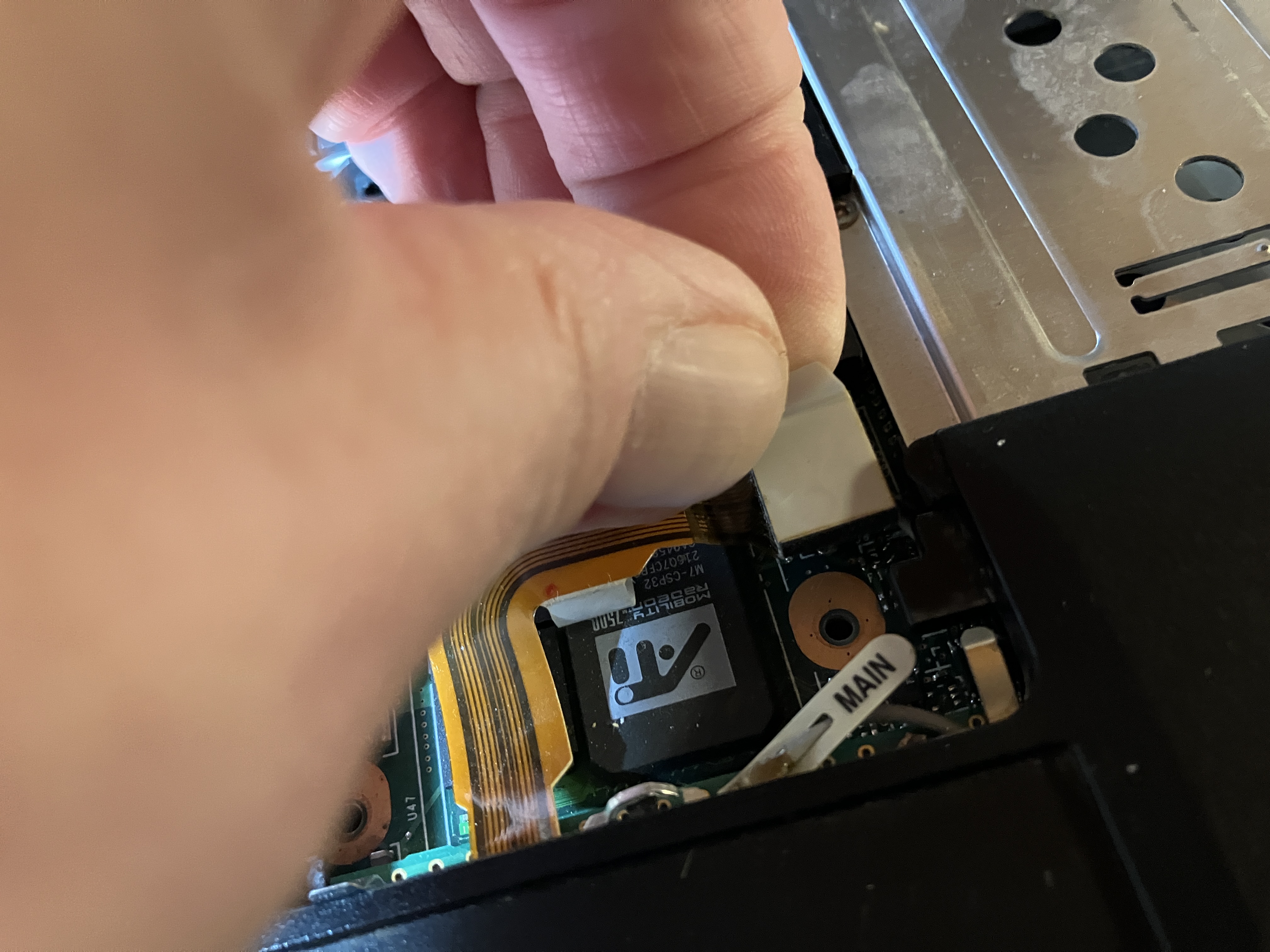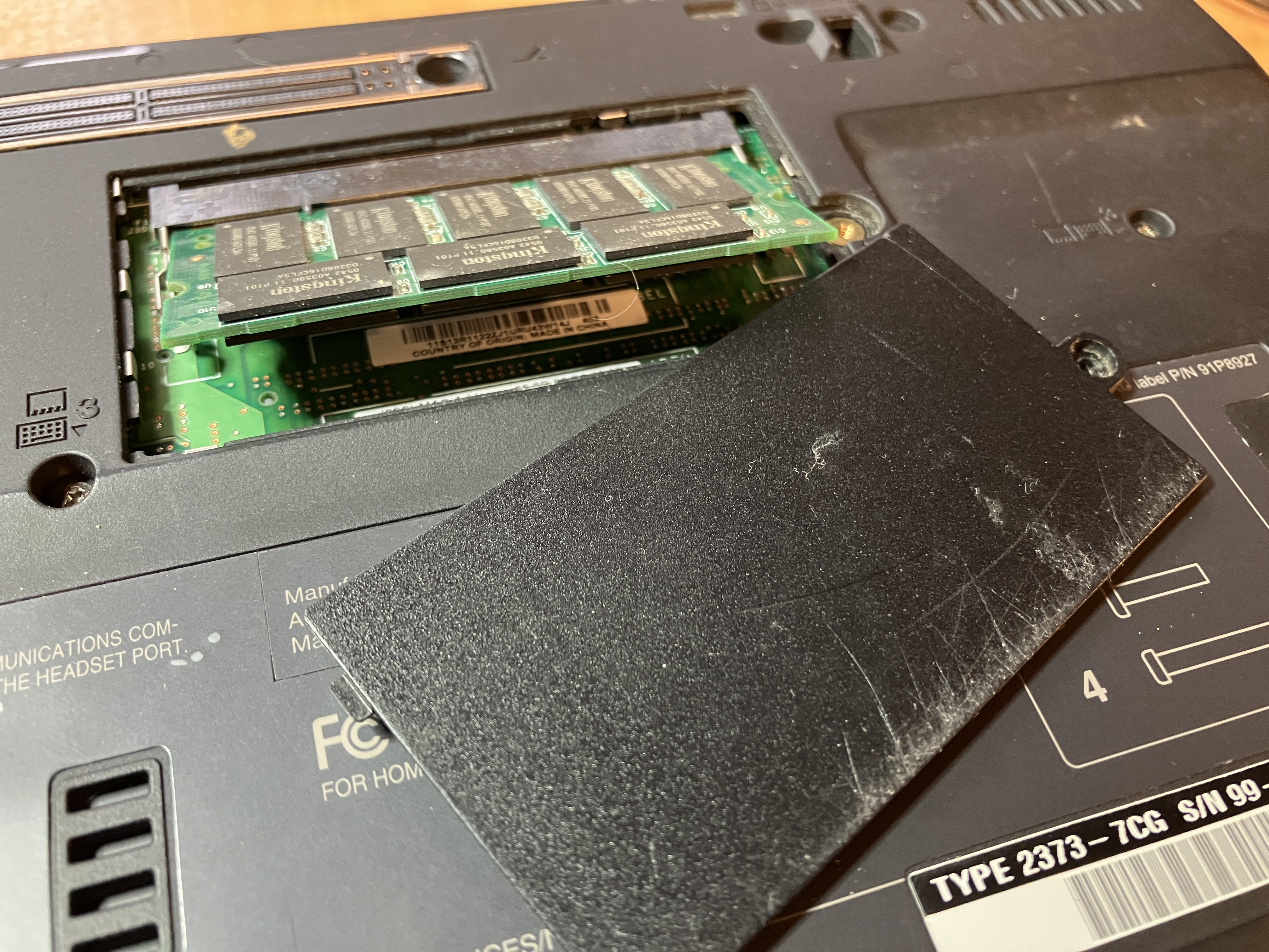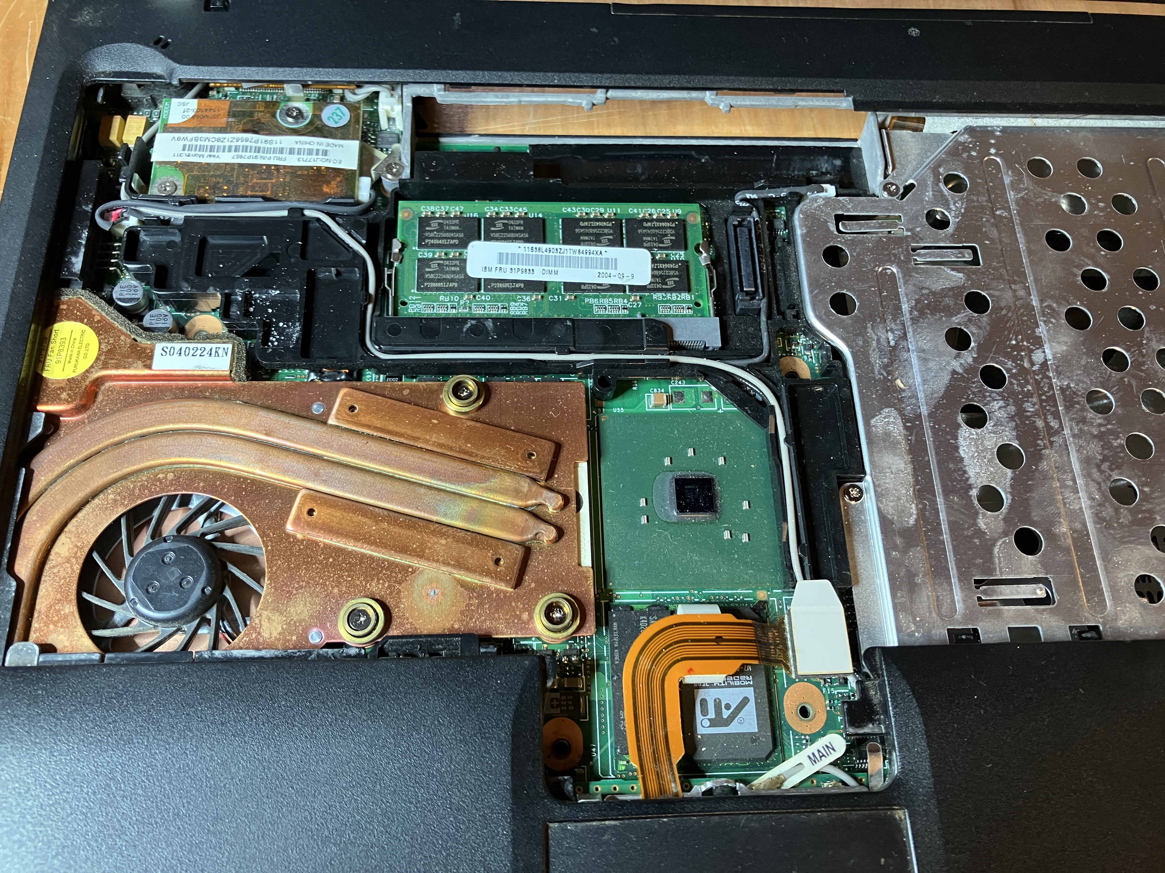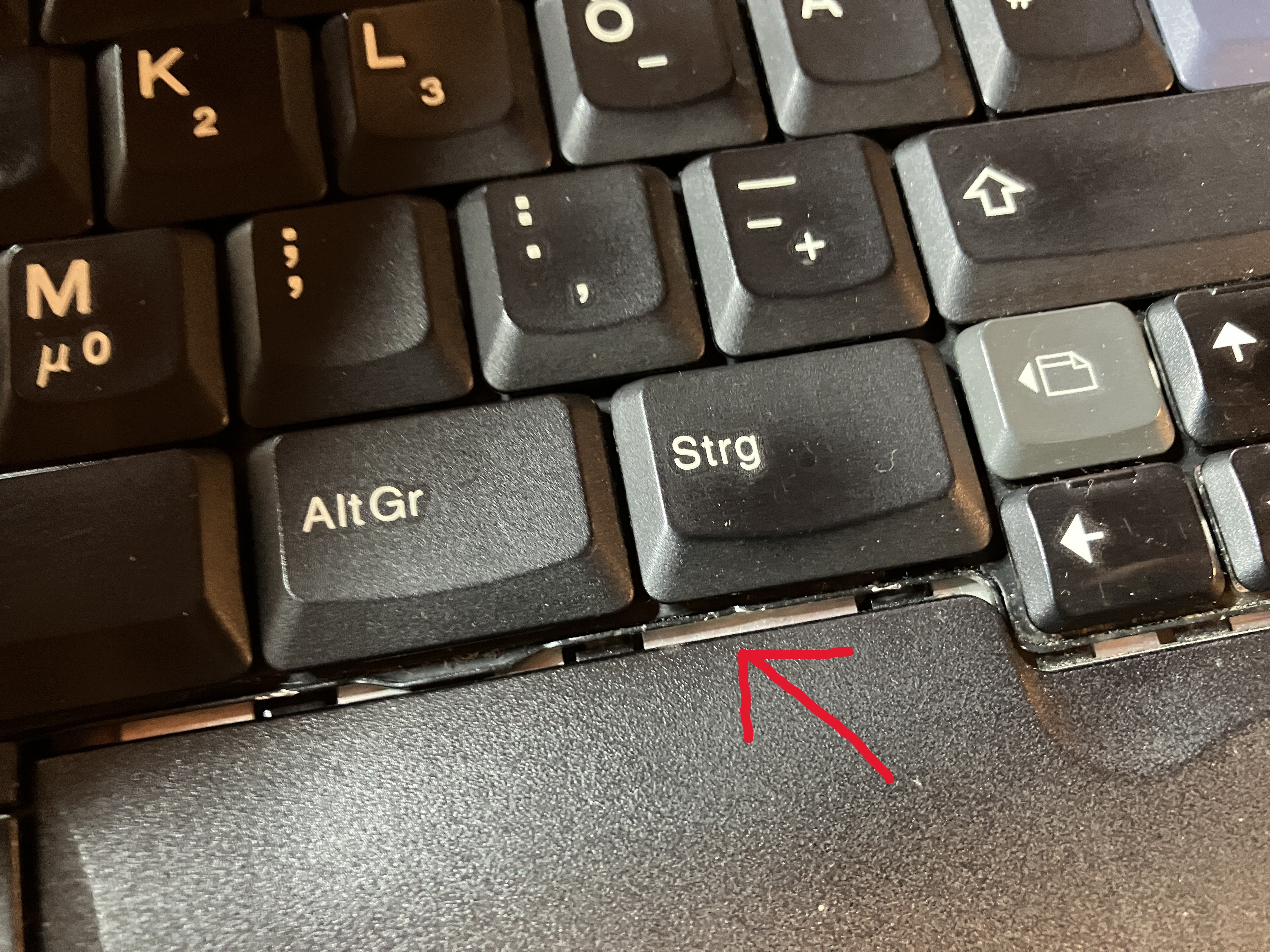 Laufwerk) sind Spuren von Flüssigkeit(en) zu sehen. Diese hat villeicht die Trackpoint Tasten still gelegt. Auf Folgebild 2 sieht man den schon gelösten RAM