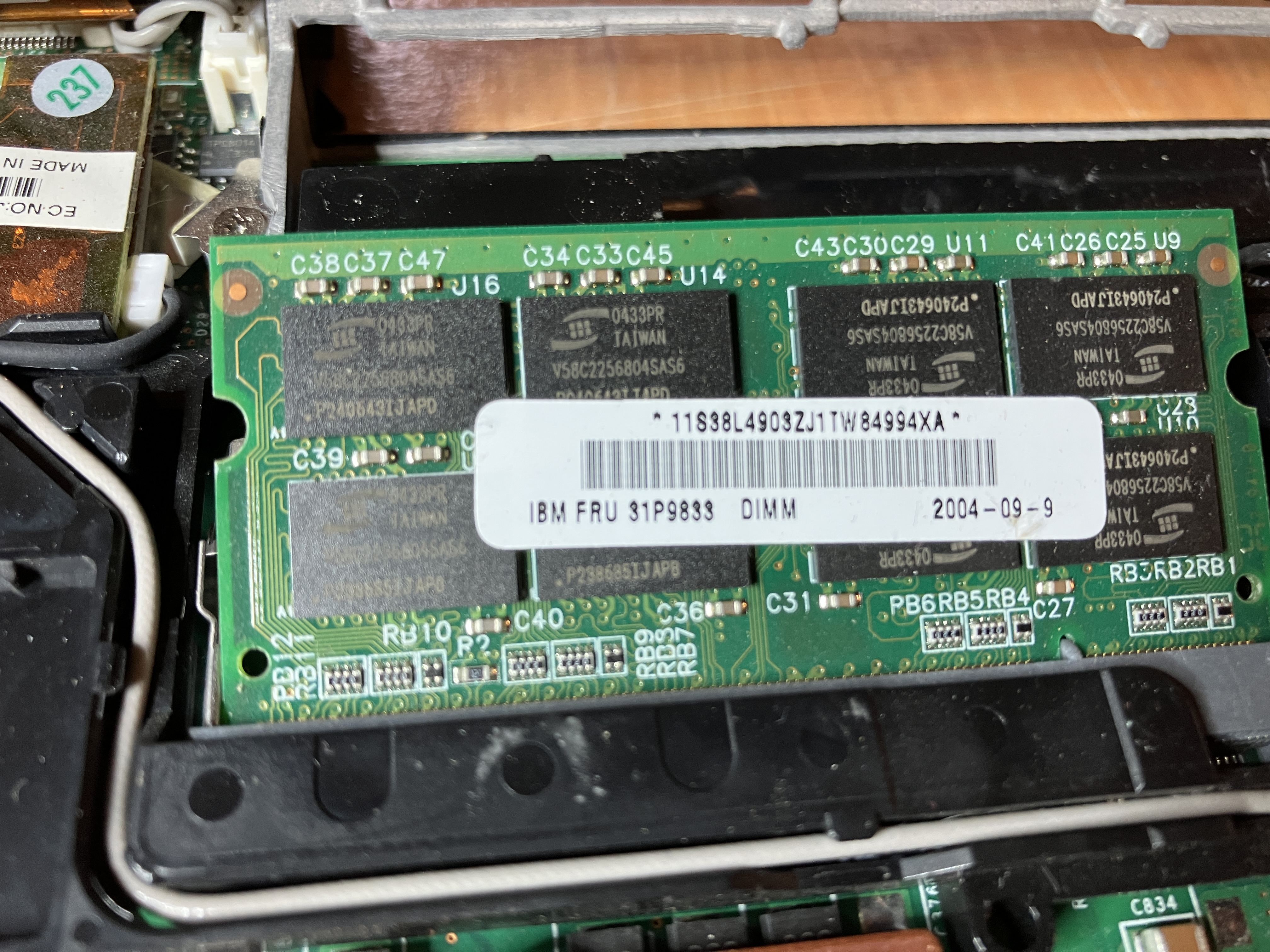 Baustein mit der IBM FRU 31P9833. Eine Suche im Internet enthüllt das es ein 512 MB PC2700 S0 RAM ist. Auf Folgebild 3 ist die Modem Karte zu erkennen. Diese ist mit