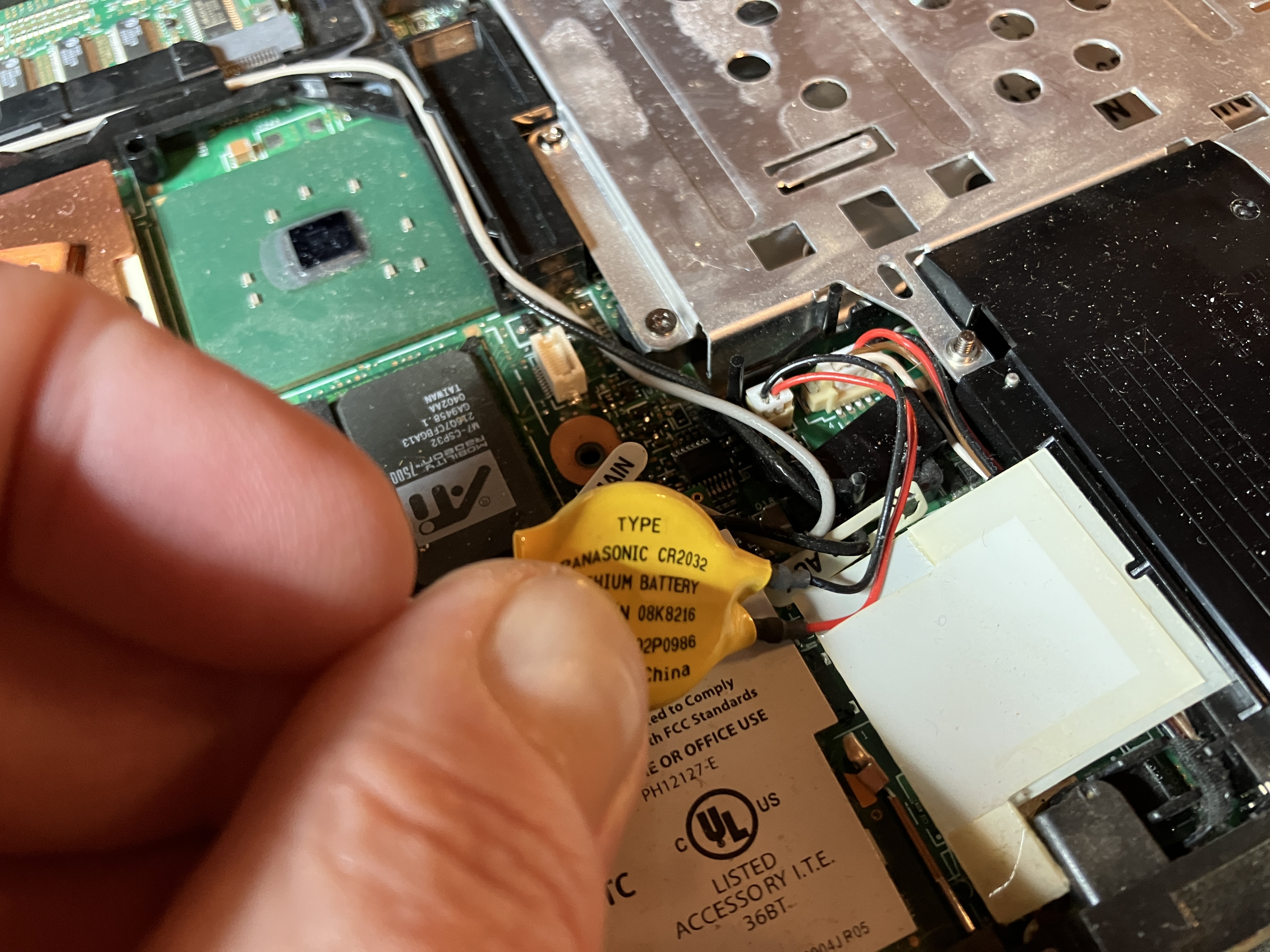 Batterie (FRU 08K8216) ist mit zwei dürren Kabeln an einem Stecker mit dem Mainboard verbunden. Es empfiehlt sich, nicht an den Kabel zu ziehen, sondern den Stecker mit