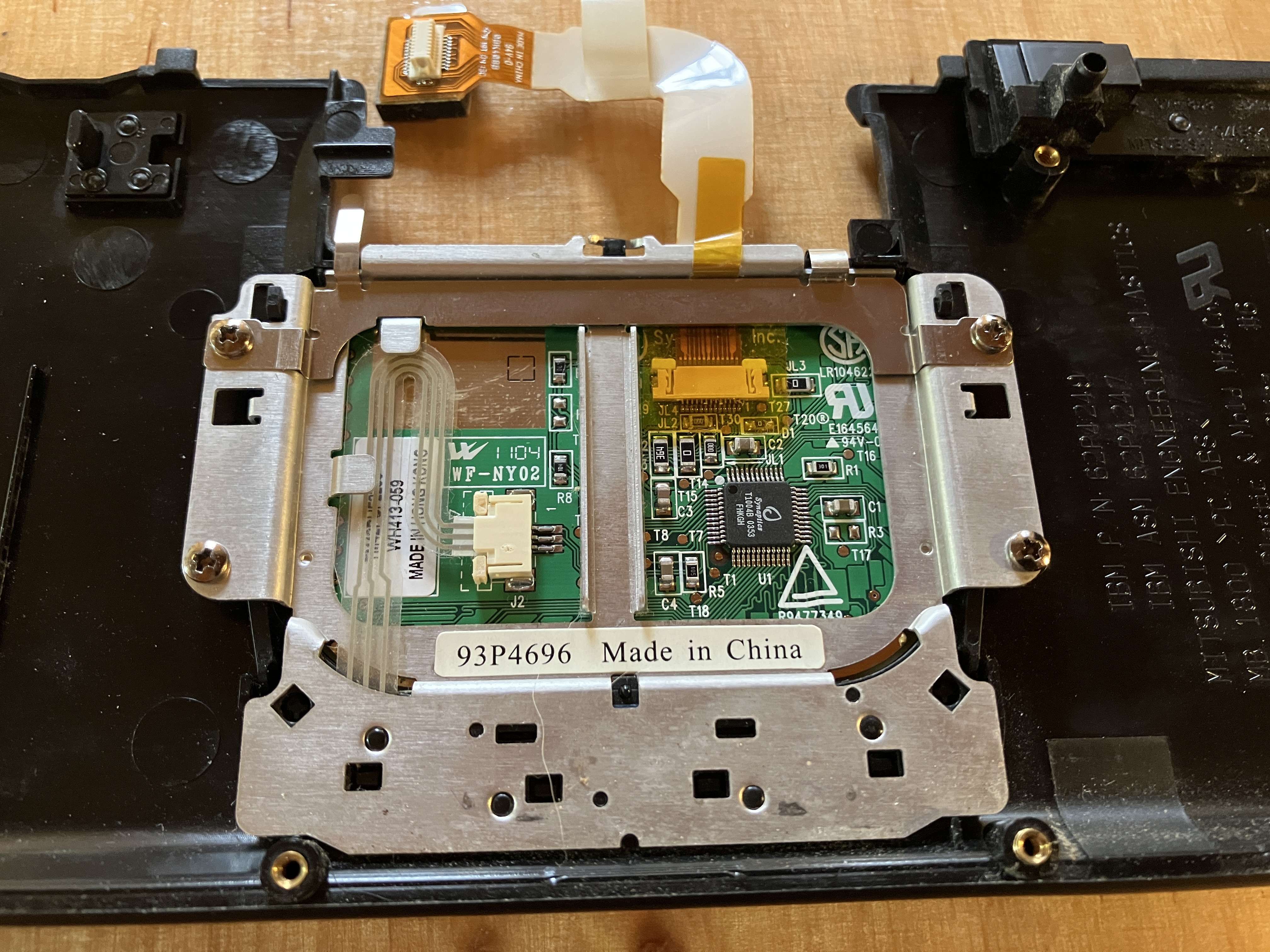 thront das Touchpad mit den beiden (nicht funktionierenden) Buttons. Das läßt sich vom Palmrest trennen und als Ersatzteil (FRU 93P4696) erwerben. Die Teile kosten um die