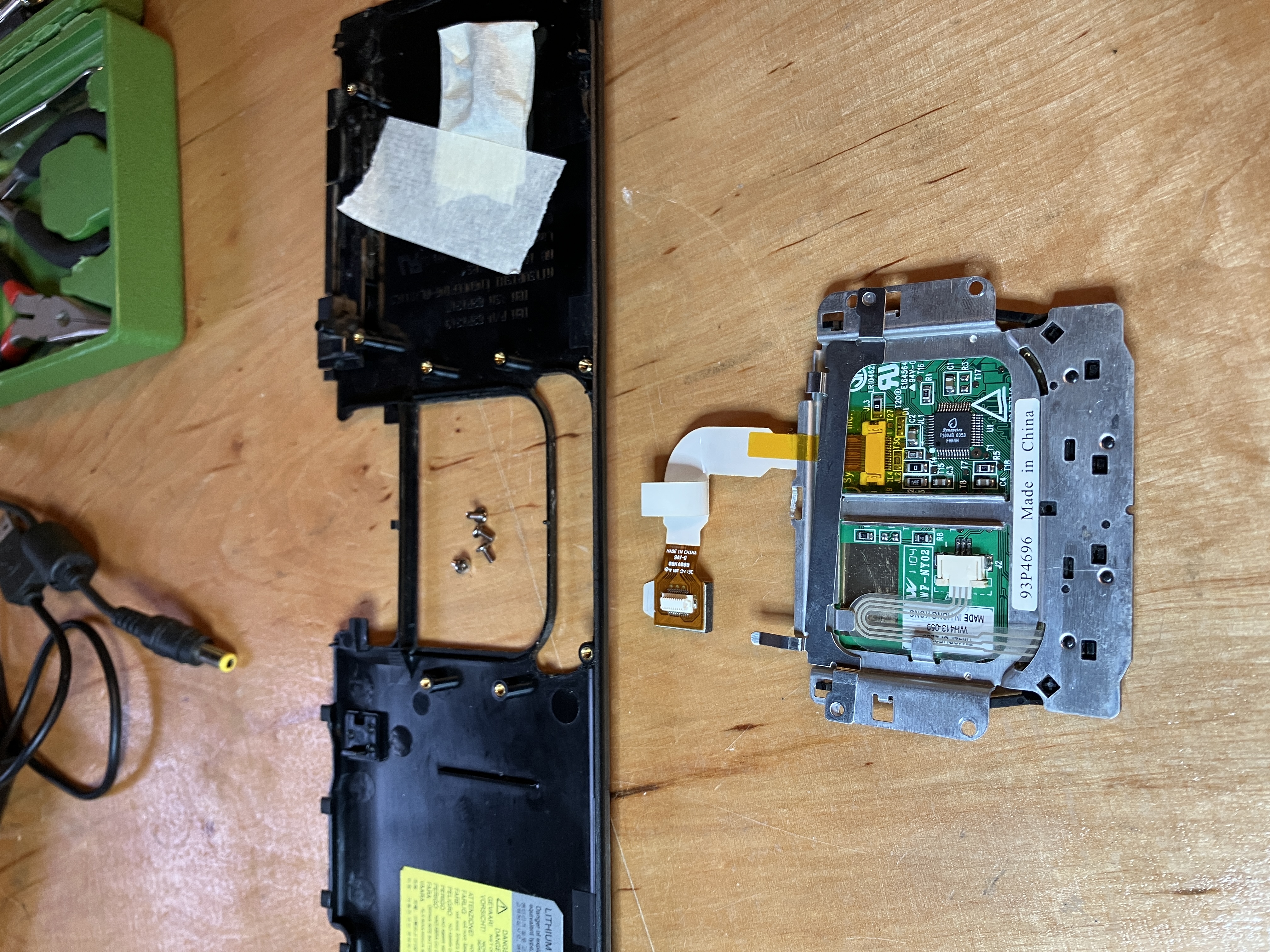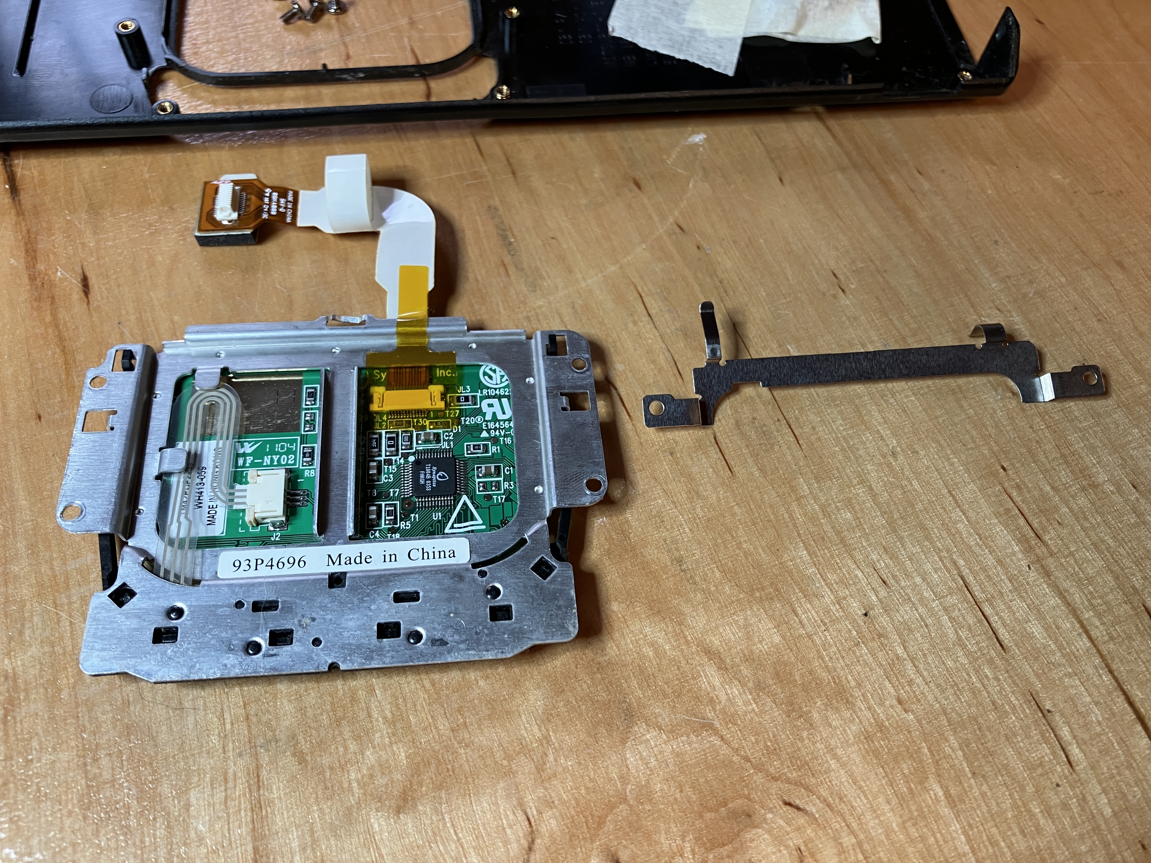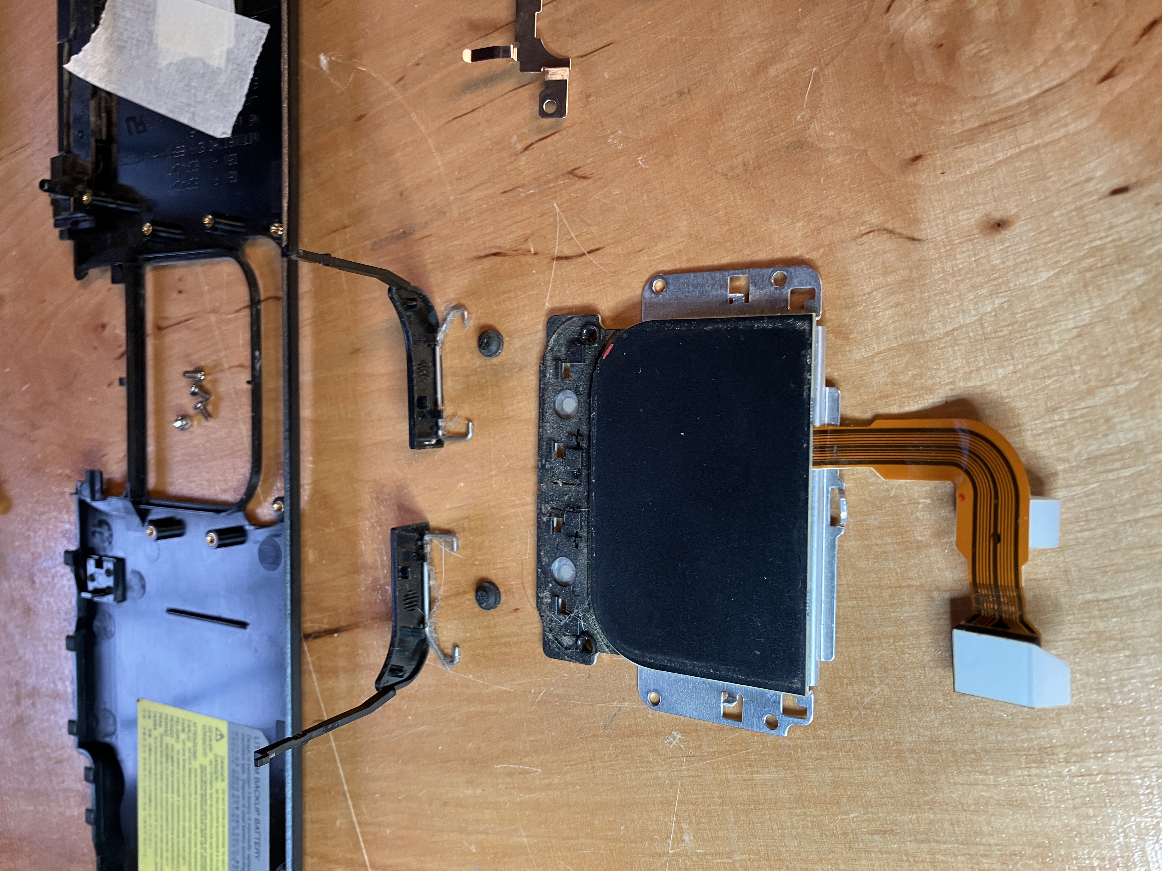 Das Touchpad mit den defekten Tasten wird ausgebaut (4 Schrauben am Palmrest und eine Klammer, Siehe Folgebild 1). Im Folgebild 2 und 3 gut zu erkennen, das