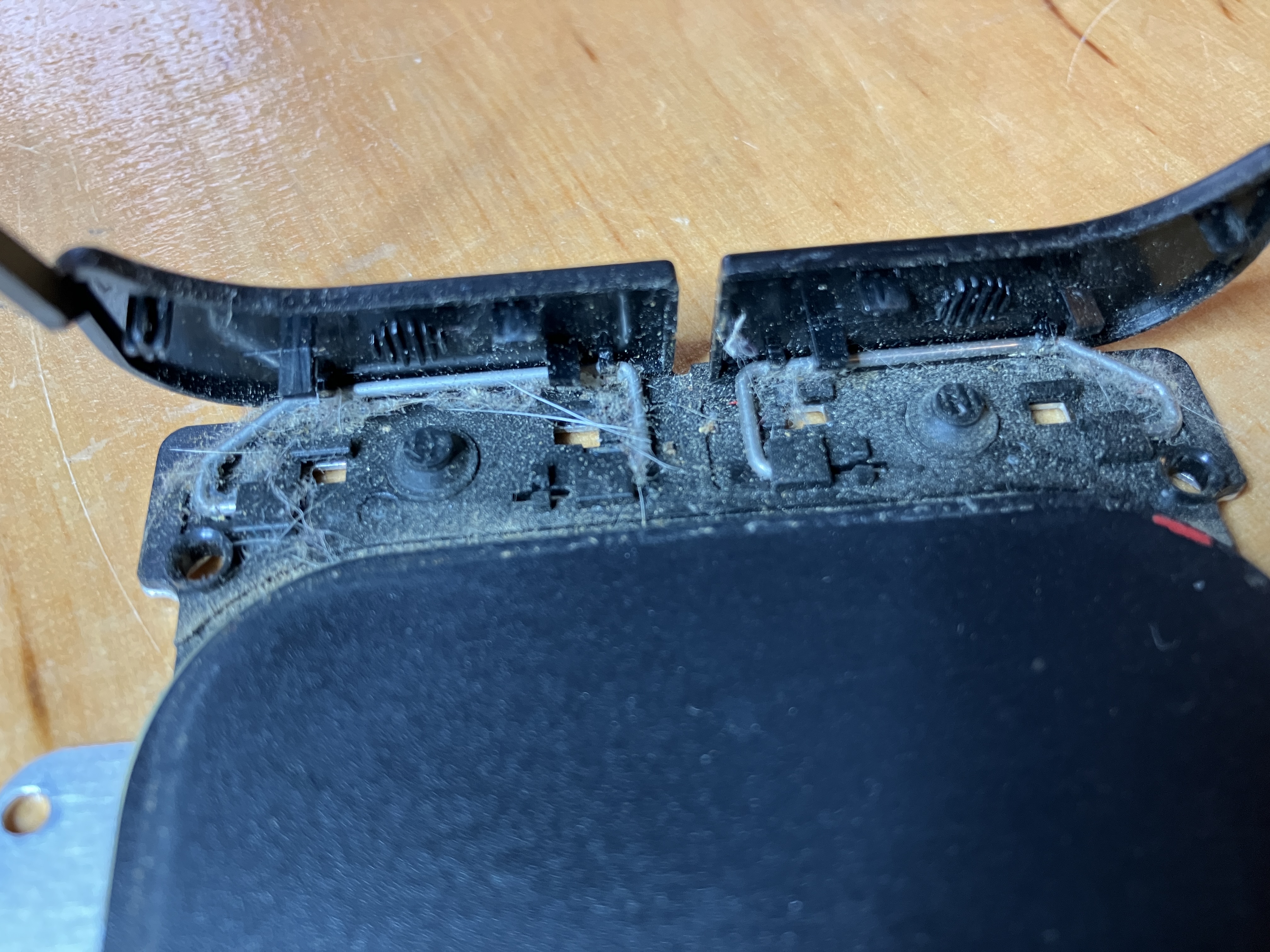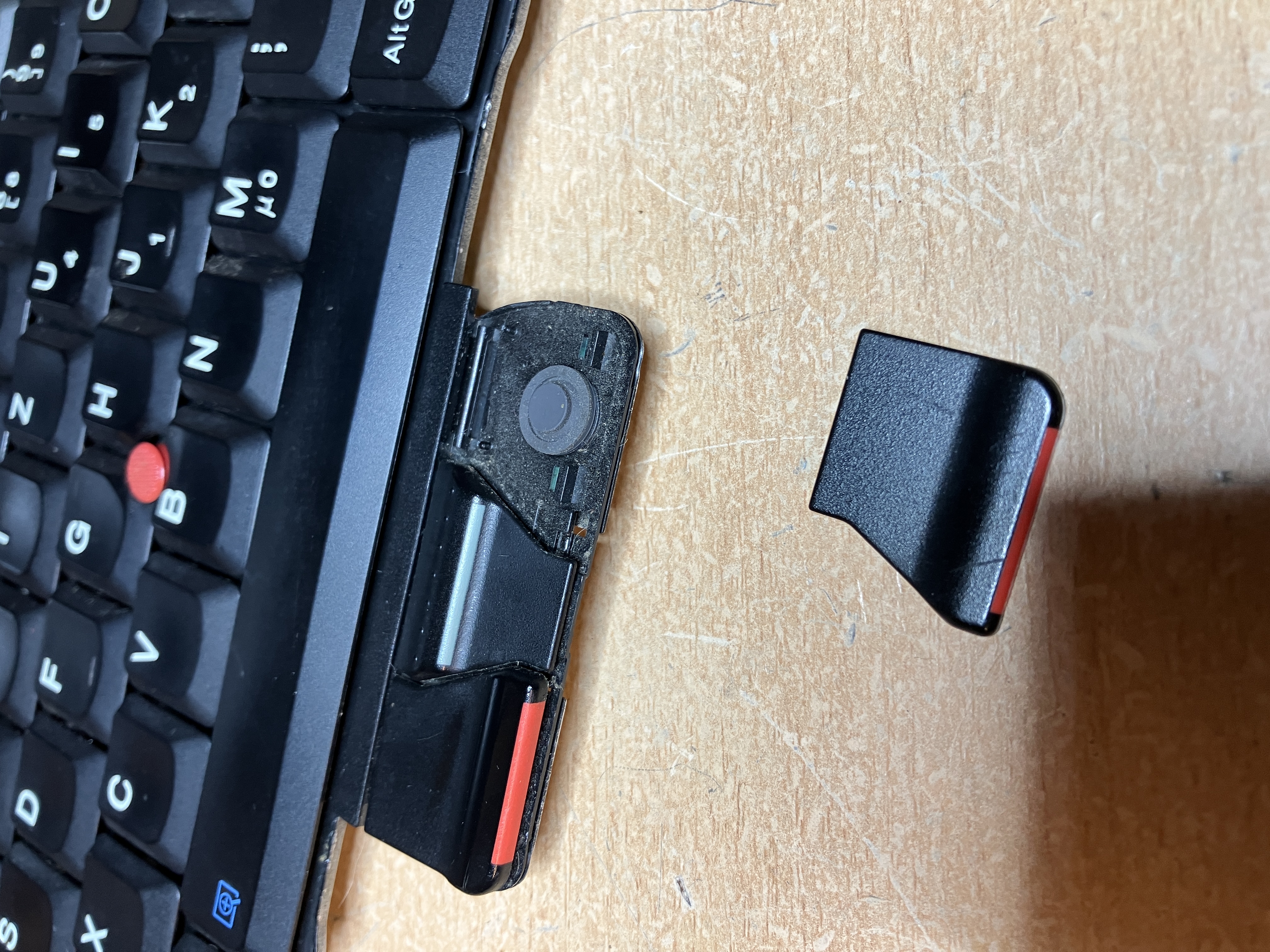 Auch diese lässt sich vorsichtig heraushebeln. Der darunterliegende Gummipuffer hat die gleiche Funktion wie bei den Tasten beim Touchpoint. Dazu wird noch